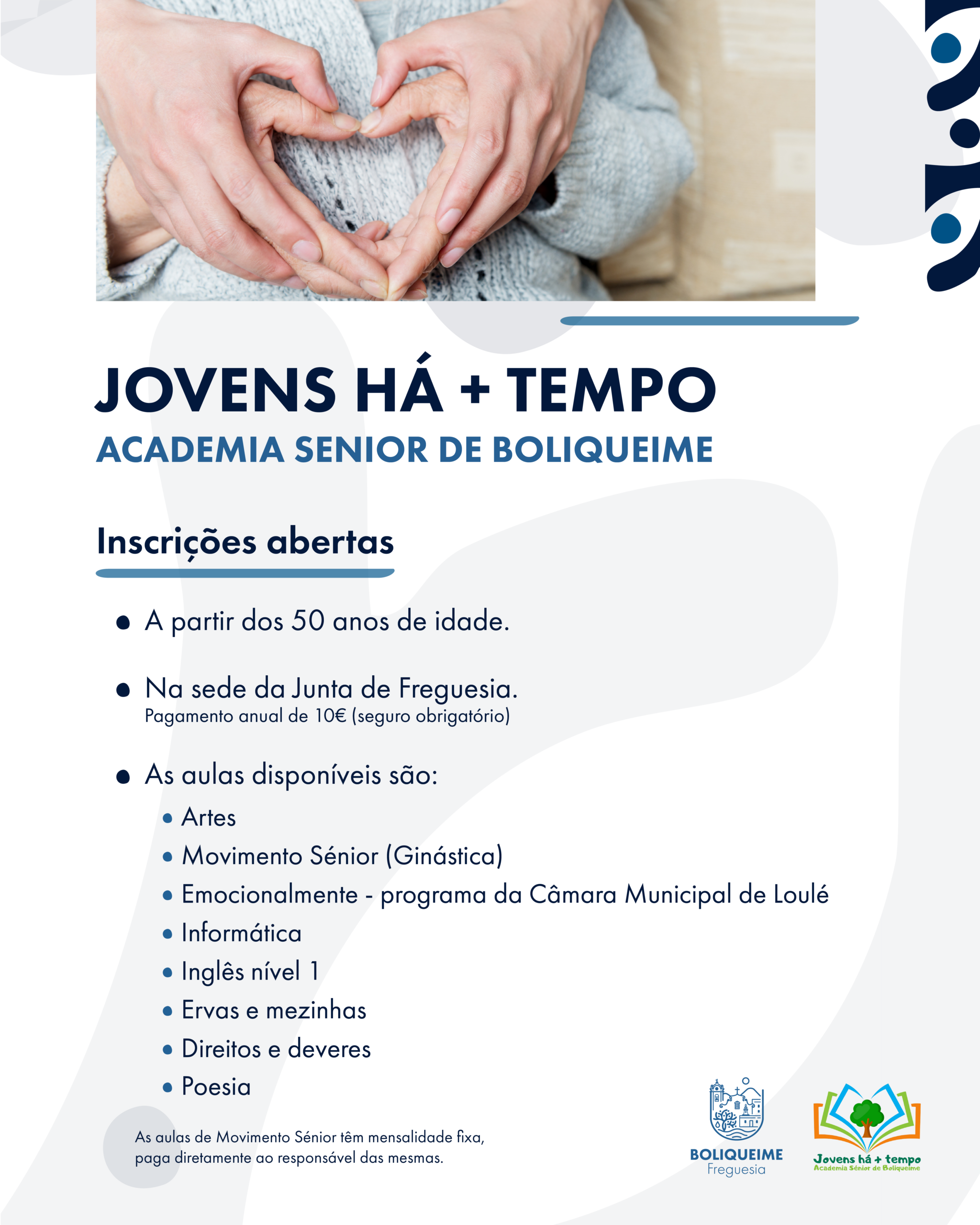 As inscrições encontram-se abertas e podem ser efetuadas nas instalações da Junta de Freguesia de Boliqueime. A oferta formativa inclui áreas como Artes, Movimento Sénior, Educação Emocional, Informática, Inglês, Ervas e Mezinhas, Direitos e Deveres e Poesia, estando as atividades disponíveis para interessados com mais de 50 anos.