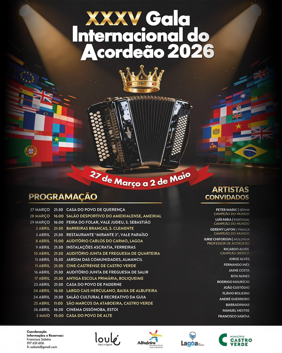 O Auditório Carlos do Carmo, em Lagoa, recebe no próximo dia 8 de abril, pelas 15:00, a XXXV Gala Internacional do Acordeão, um espetáculo que volta a destacar este instrumento emblemático.