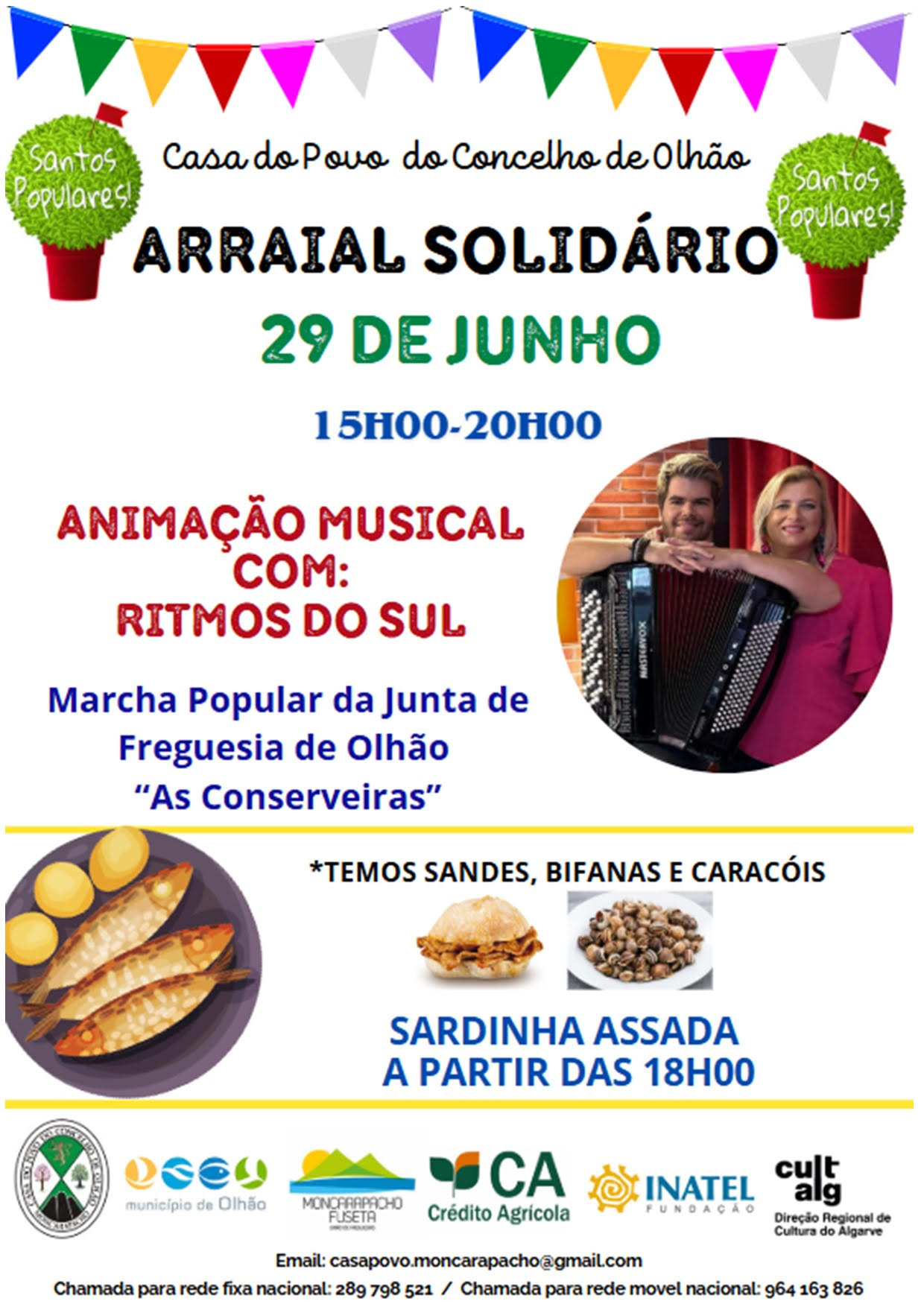A Casa Do Povo do Concelho de Olhão – Moncarapacho vai organizar, no próximo dia 29 de junho (domingo), um animado Arraial Solidário no âmbito das festividades dos Santos Populares. O evento decorre entre as 15:00 e as 20:00 e promete uma tarde recheada de convívio, com muita música, marcha e sardinha assada.