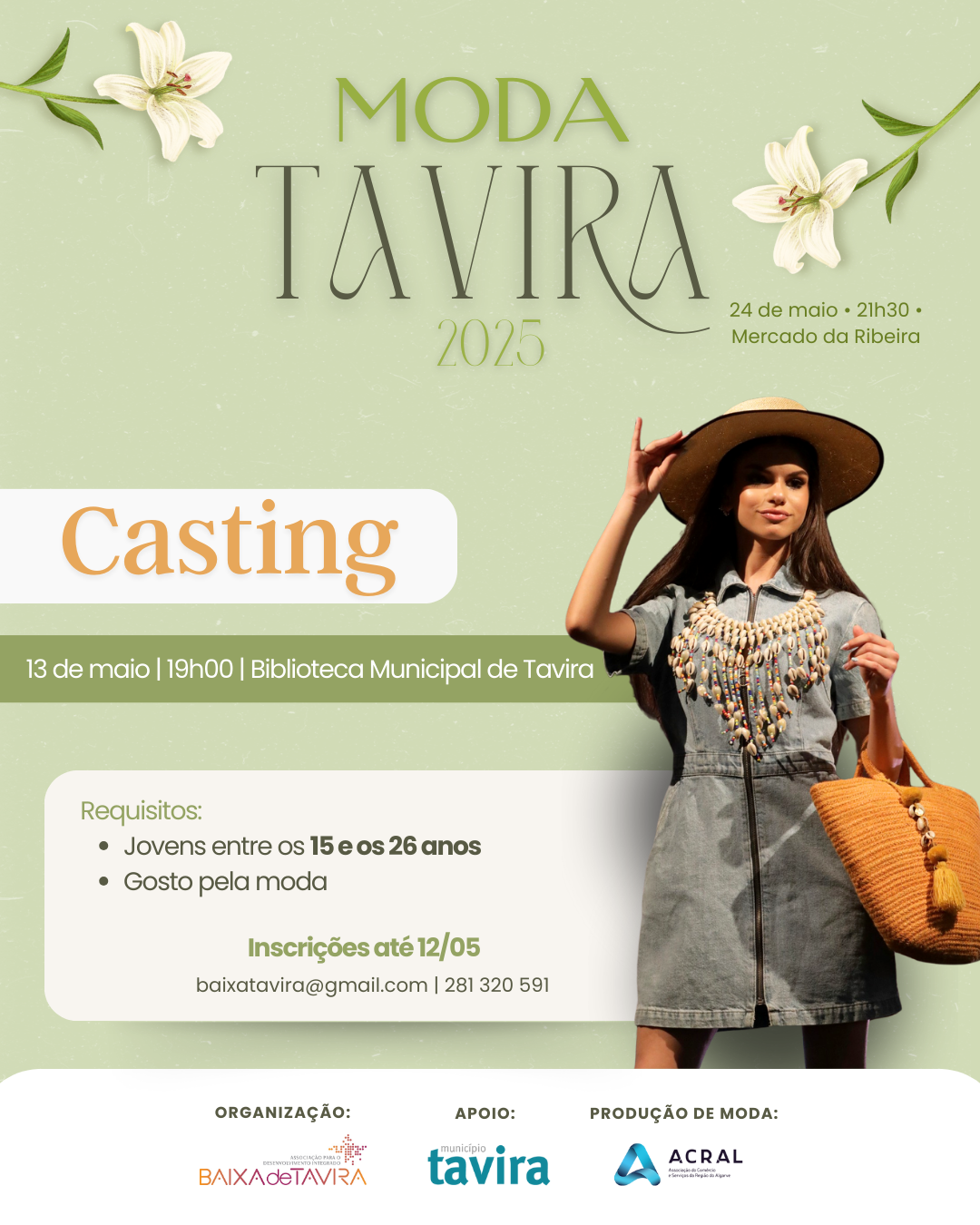 A Associação Baixa de Tavira promove no próximo dia 24 de maio, pelas 21:30, mais uma edição do evento “Moda Tavira 2025”, que terá lugar no emblemático Mercado da Ribeira. As inscrições para o casting já estão a decorrer. A iniciativa, que conta com o apoio do Município de Tavira, visa celebrar o talento local e a criatividade, unindo moda, juventude e dinamização urbana.