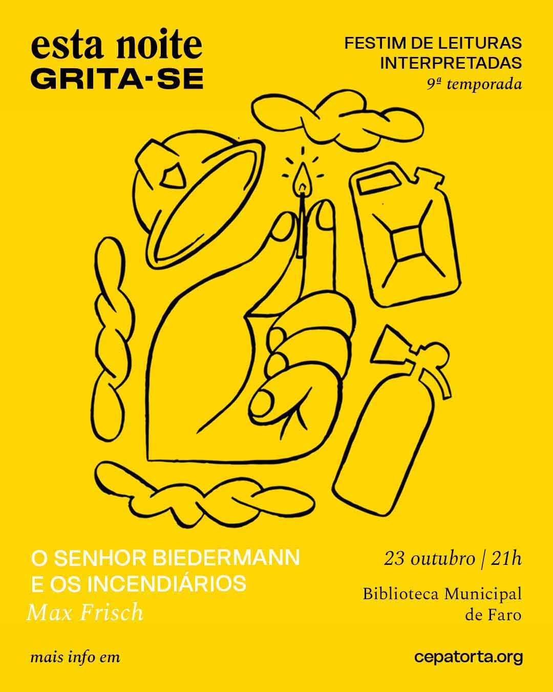 O festim “Esta Noite Grita-se” regressa a Faro para mais uma edição dedicada à leitura encenada, trazendo consigo três noites de teatro em formato intimista. A primeira sessão acontece já esta quinta-feira, 23 de outubro, às 21:00, na Biblioteca Municipal de Faro, com a leitura do texto “O Senhor Biedermann e os Incendiários”, de Max Frisch.