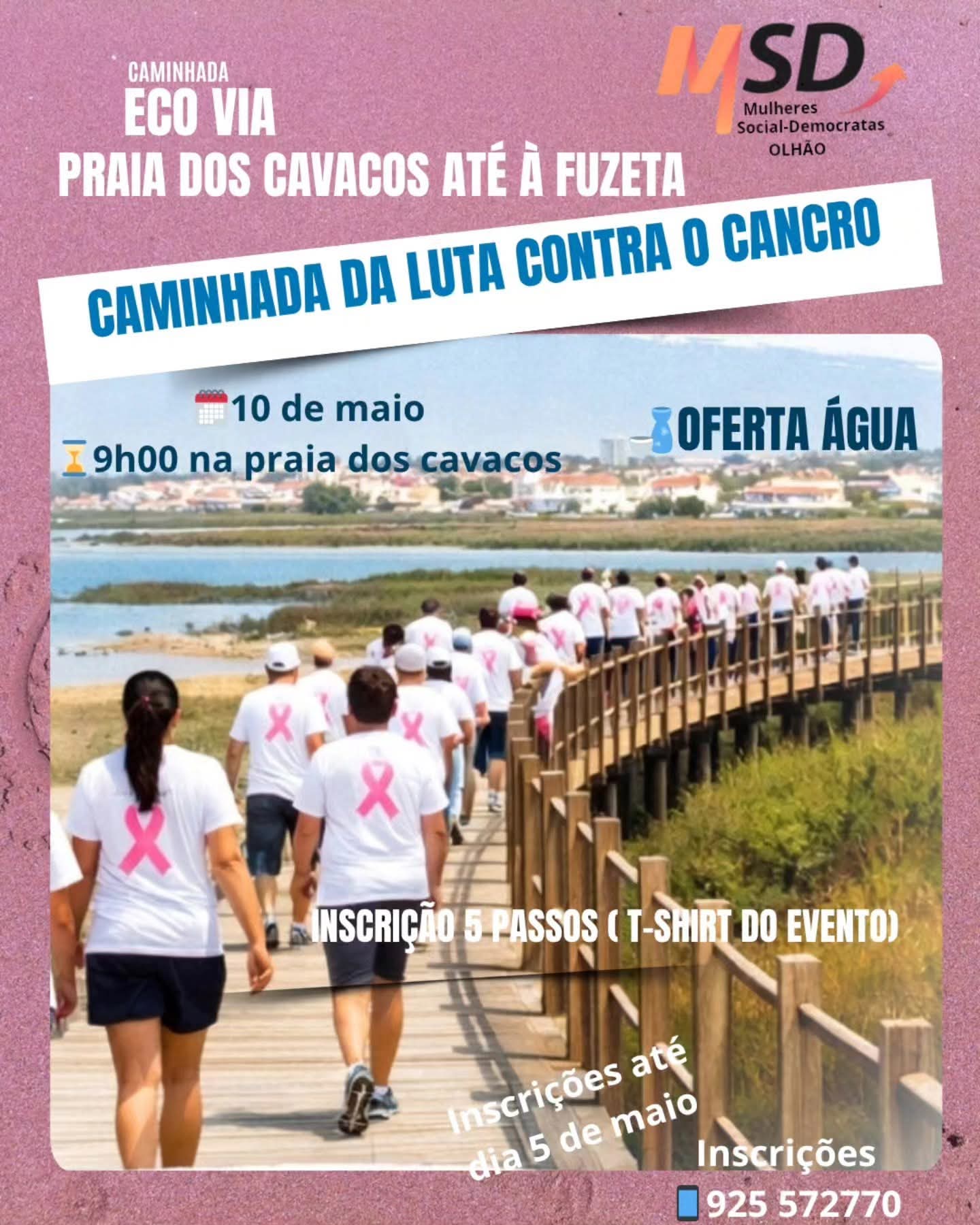 A ecovia entre a Praia dos Cavacos e a Fuzeta, no concelho de Olhão, vai receber, no próximo dia 10 de maio, uma caminhada solidária dedicada à sensibilização para a luta contra o cancro. A iniciativa é promovida pelas Mulheres Social-Democratas de Olhão e pretende mobilizar a comunidade para esta causa.