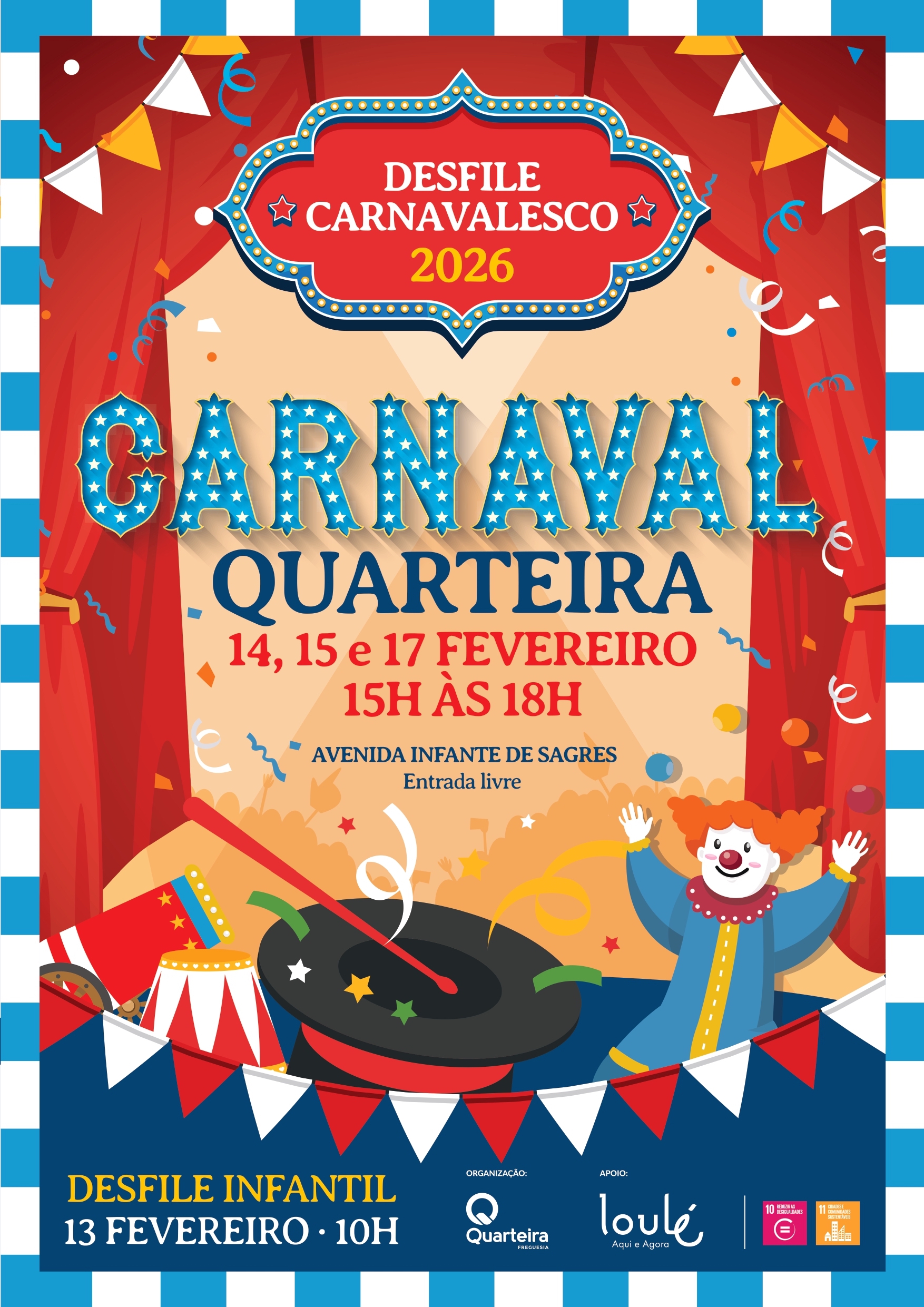 A Junta de Freguesia de Quarteira anunciou que o Carnaval vai ser celebrado nos dias 14, 15 e 17 de fevereiro, com o tradicional corso carnavalesco a decorrer na Avenida Infante de Sagres, entre as 15:00 e as 18:00.