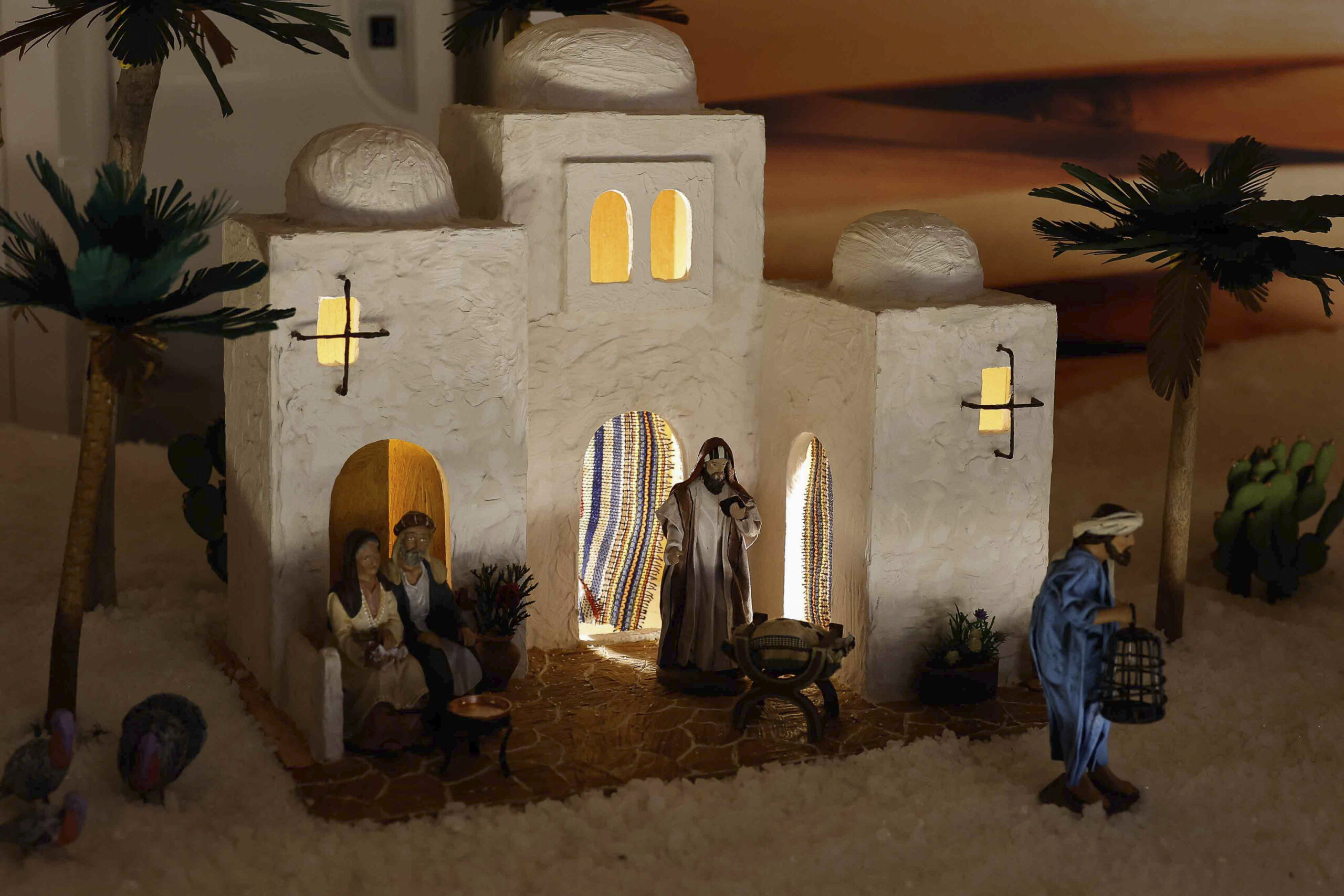 Um oásis, mais árvores de palmeira e uma hospedagem são outros elementos do presépio, que tem cerca de 35 metros, 11 toneladas de sal, 1.000 figuras, fontes ou bonecos elétricos que recriam atividades, precisou José Gonçalves.