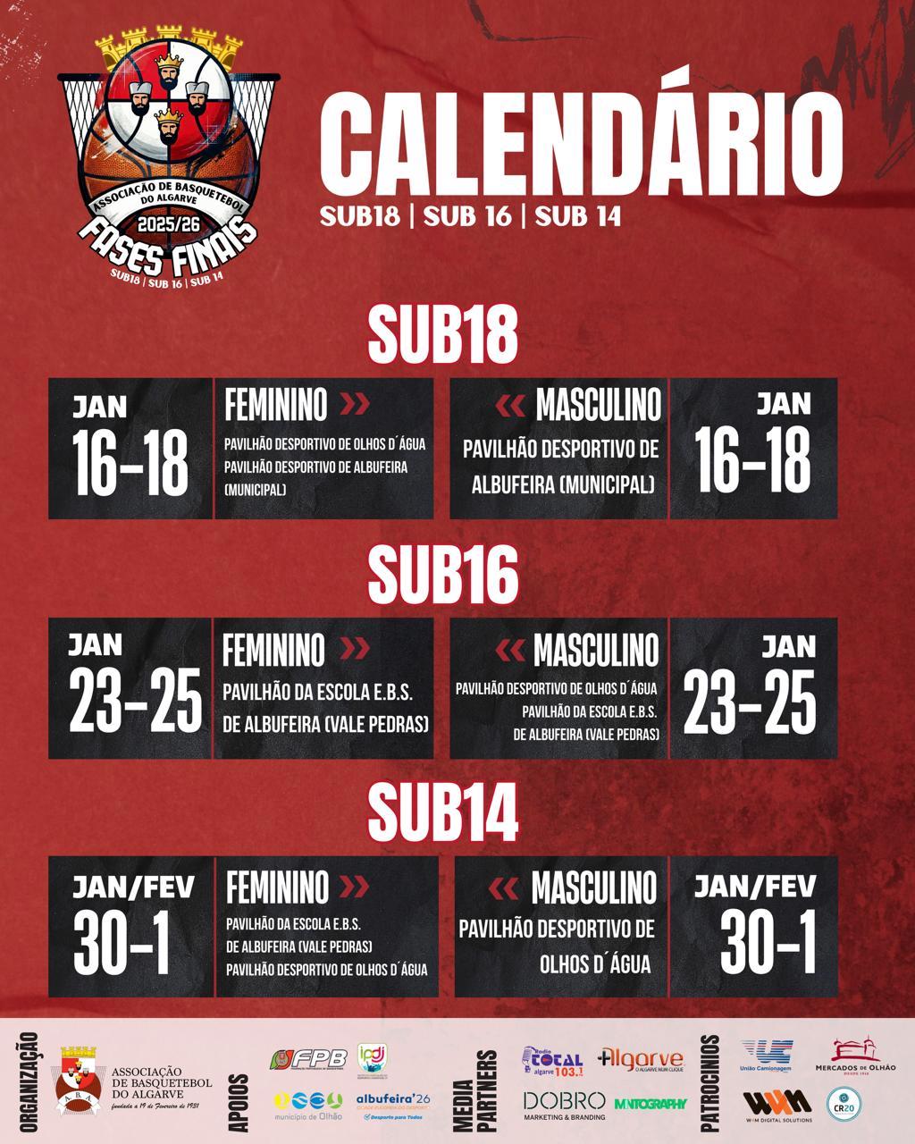 A Associação de Basquetebol do Algarve anunciou que o mês de janeiro é dedicado às Fases Finais Regionais dos escalões Sub18, Sub16 e Sub14, masculinos e femininos, uma das etapas mais emotivas e competitivas da época desportiva.