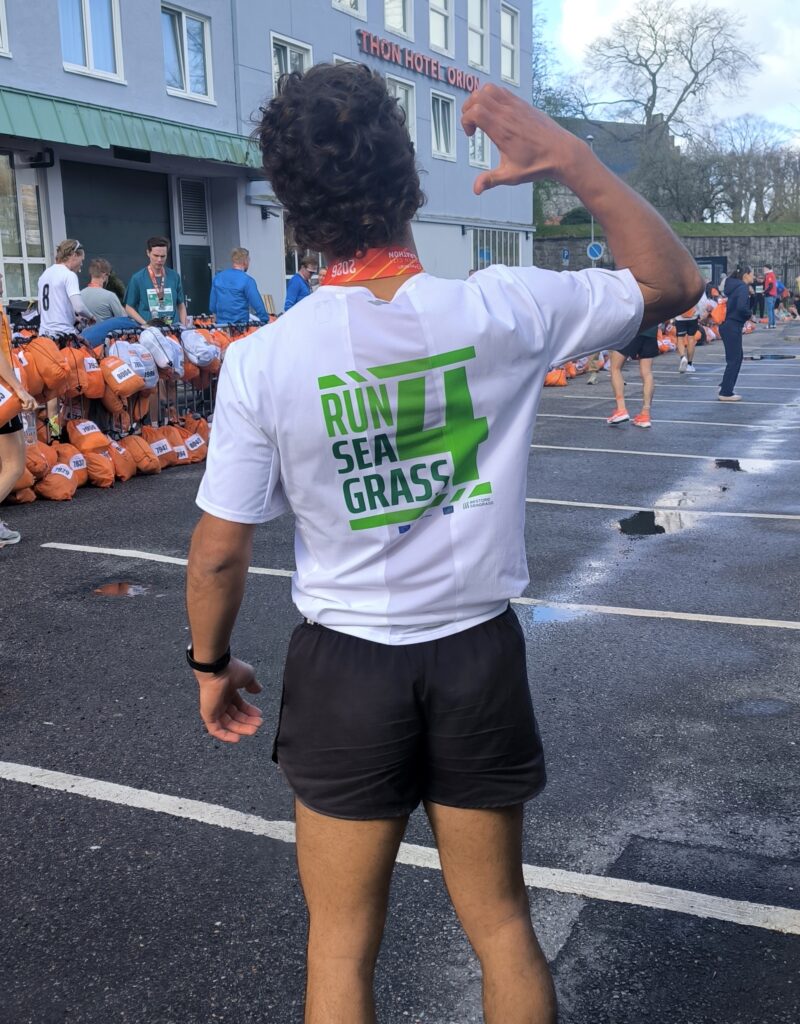 Durante a corrida, Guilherme Vale utilizou uma t-shirt com a inscrição “Run4Seagrass”, estabelecendo uma ligação direta entre o desafio físico e a mensagem ambiental.