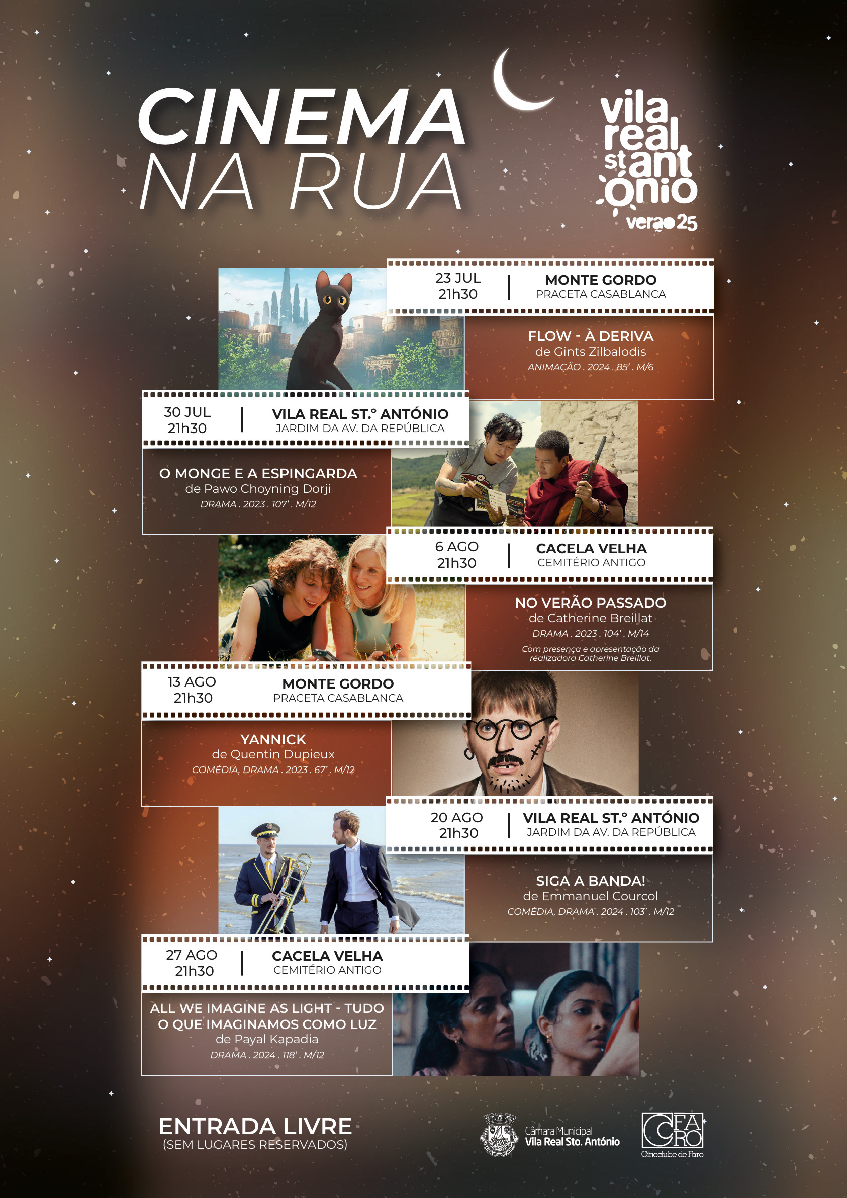 Em comunicado, a autarquia sublinha que esta iniciativa “integra a agenda cultural de verão do município” e oferece “momentos de cinema ao ar livre nas três freguesias do concelho: Vila Real de Santo António (Jardim da Avenida da República), Monte Gordo (Praceta Casablanca) e Cacela Velha (no cemitério antigo), proporcionando uma experiência acessível e envolvente para os públicos”.