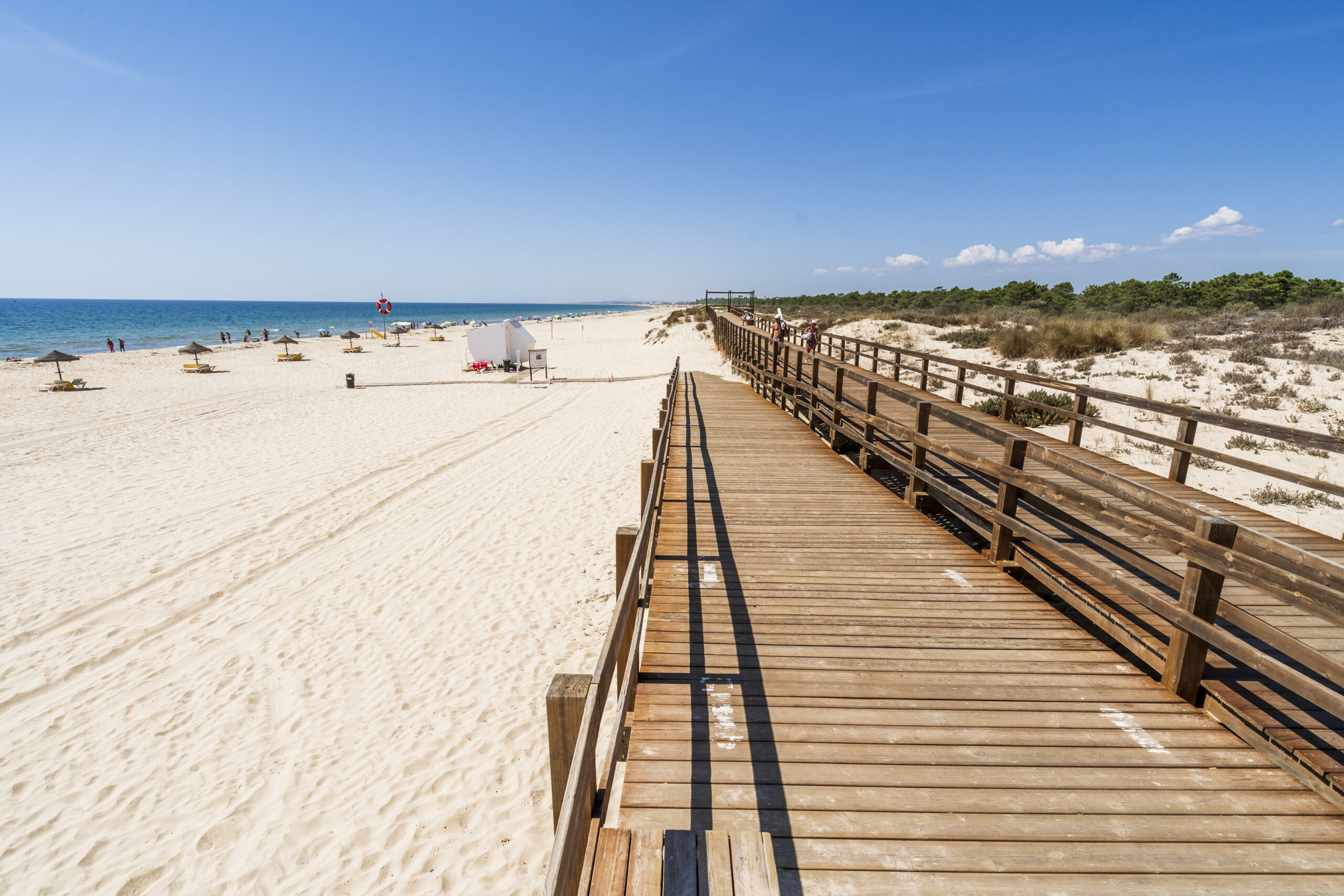Em Monte Gordo, na zona concessionada UB4, é possível alugar diferentes opções de abrigo para o sol. Entre as alternativas estão sombrinhas brancas ou de colmo, ambas com direito a duas camas ou cadeiras, e toldos de lona com igual configuração.