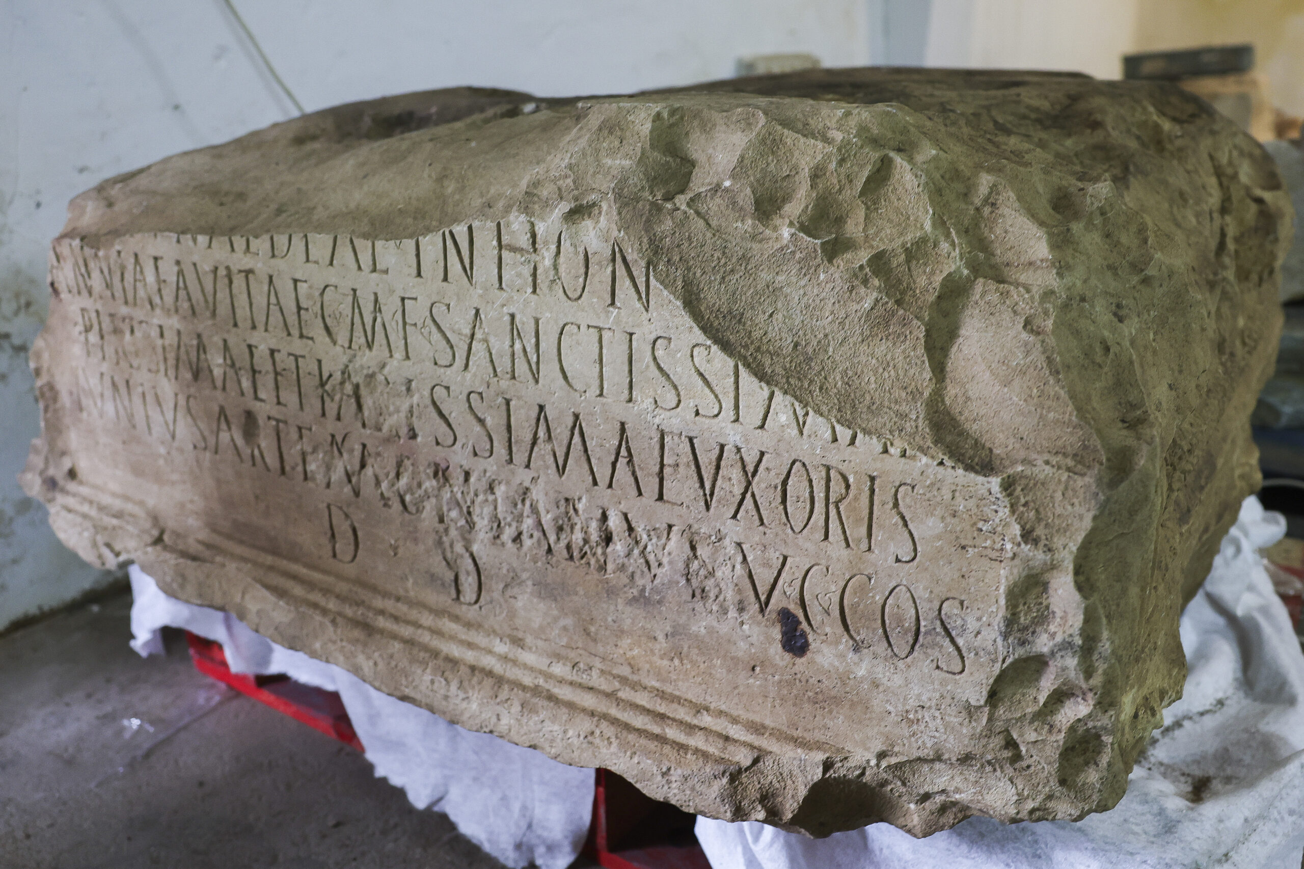 A base apresenta cinco linhas de texto em latim, embora a primeira esteja partida e a última bastante danificada, com caracteres picados ou rasurados. Ainda assim, de acordo com a transcrição preliminar, trata-se de uma dedicatória à “santíssima, piíssima e queridíssima” esposa de um provável alto cargo romano, identificado como Iunius Artemonianus.