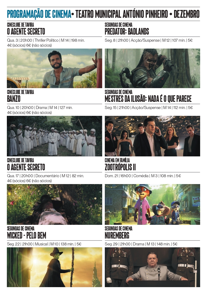 O Teatro Municipal António Pinheiro vai apresentar, ao longo do mês de dezembro, uma programação cinematográfica abrangente, dirigida a diversos públicos. A oferta inclui thrillers políticos, dramas históricos, animação para toda a família e várias estreias internacionais, integrando-se no espírito da época natalícia.