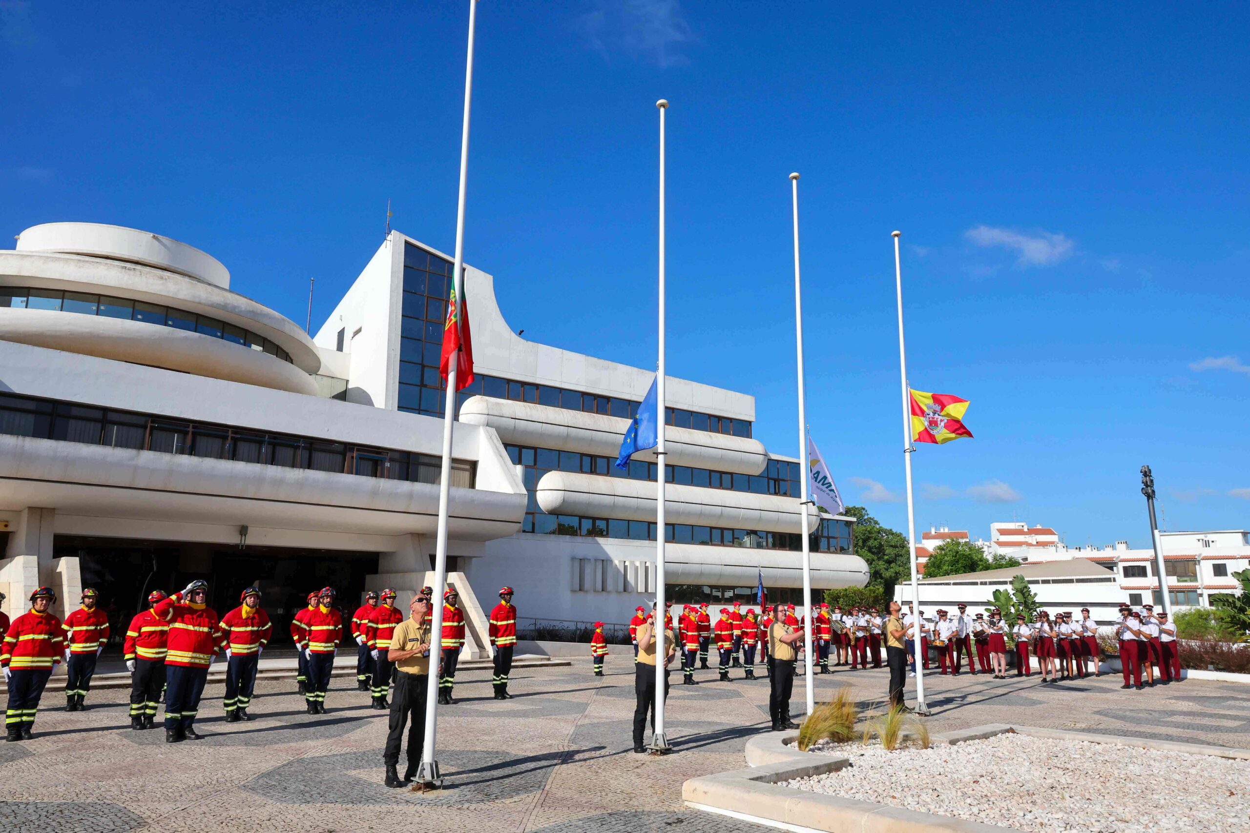 As comemorações do Dia do Município de Albufeira voltaram a mobilizar milhares de pessoas no passado dia 20 de agosto. As festividades começaram logo pela manhã com a cerimónia do hastear das bandeiras, realizada no exterior do edifício dos Paços do Concelho, ao som do Hino Nacional interpretado pela Banda da Sociedade Musical e Recreio Popular de Paderne. O momento contou ainda com a Guarda de Honra dos Bombeiros Voluntários de Albufeira e da Fanfarra.
