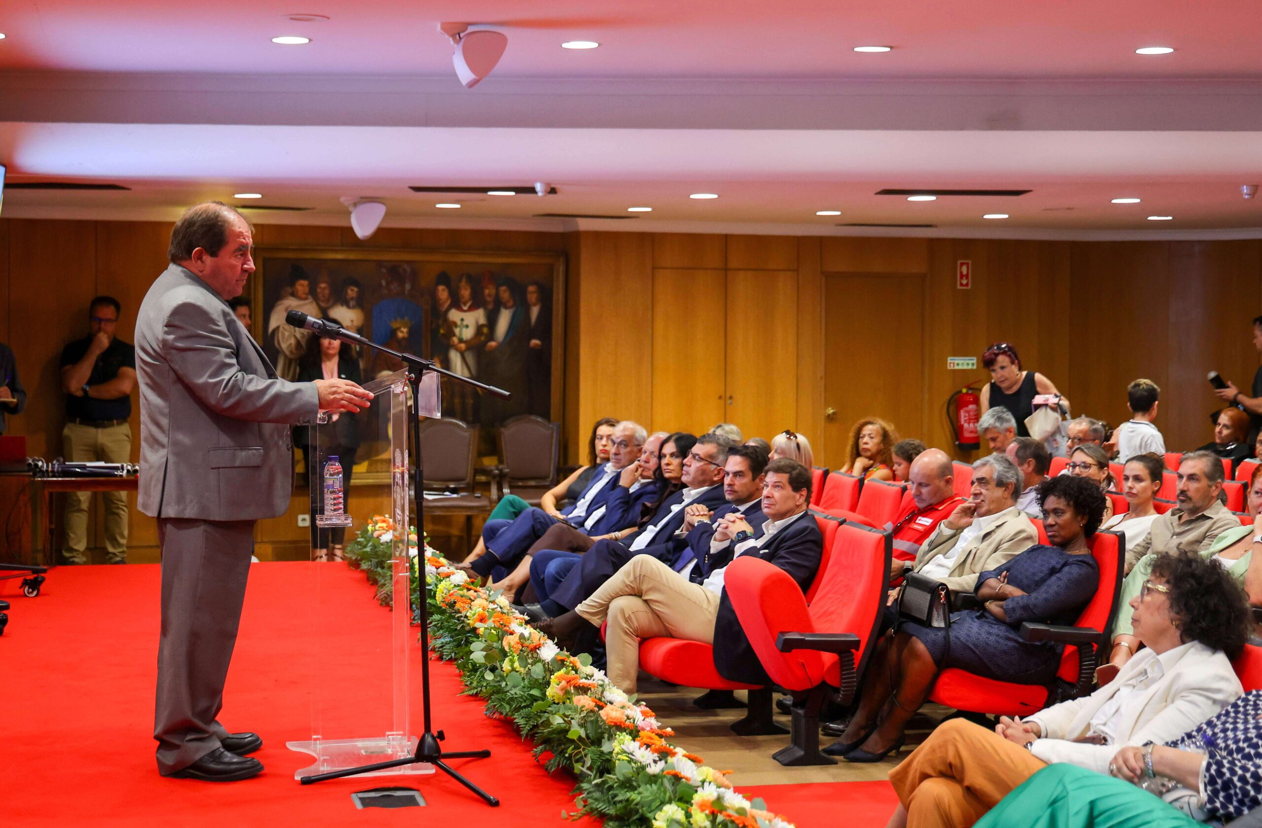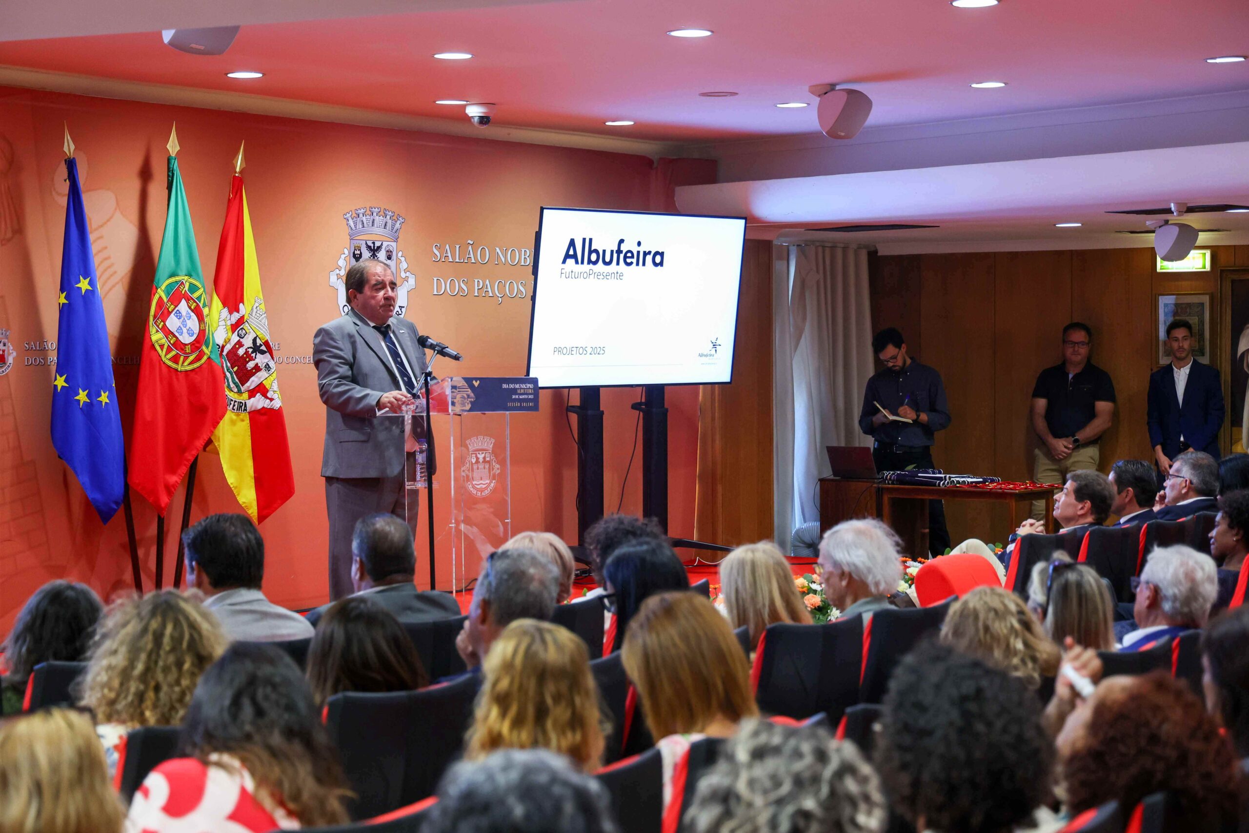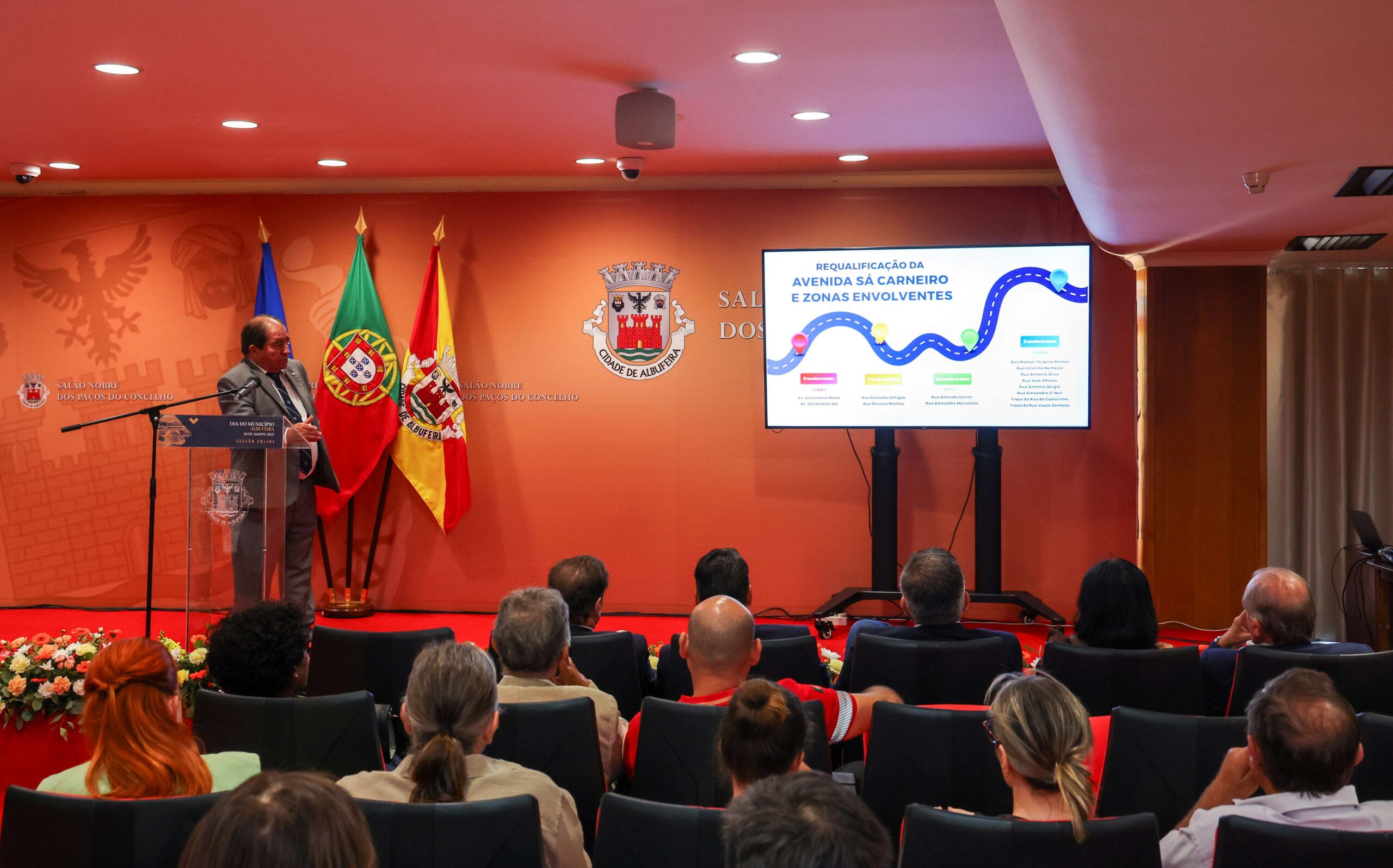 Seguiu-se a sessão solene, que encheu por completo o Salão Nobre da autarquia. O ponto alto foi a apresentação de uma visita virtual a projetos aprovados recentemente, com início previsto para os próximos meses. A apresentação esteve a cargo do presidente da Câmara Municipal, José Carlos Rolo, que sublinhou a importância de “prestar contas à comunidade, sempre de olhos postos no futuro do concelho”.