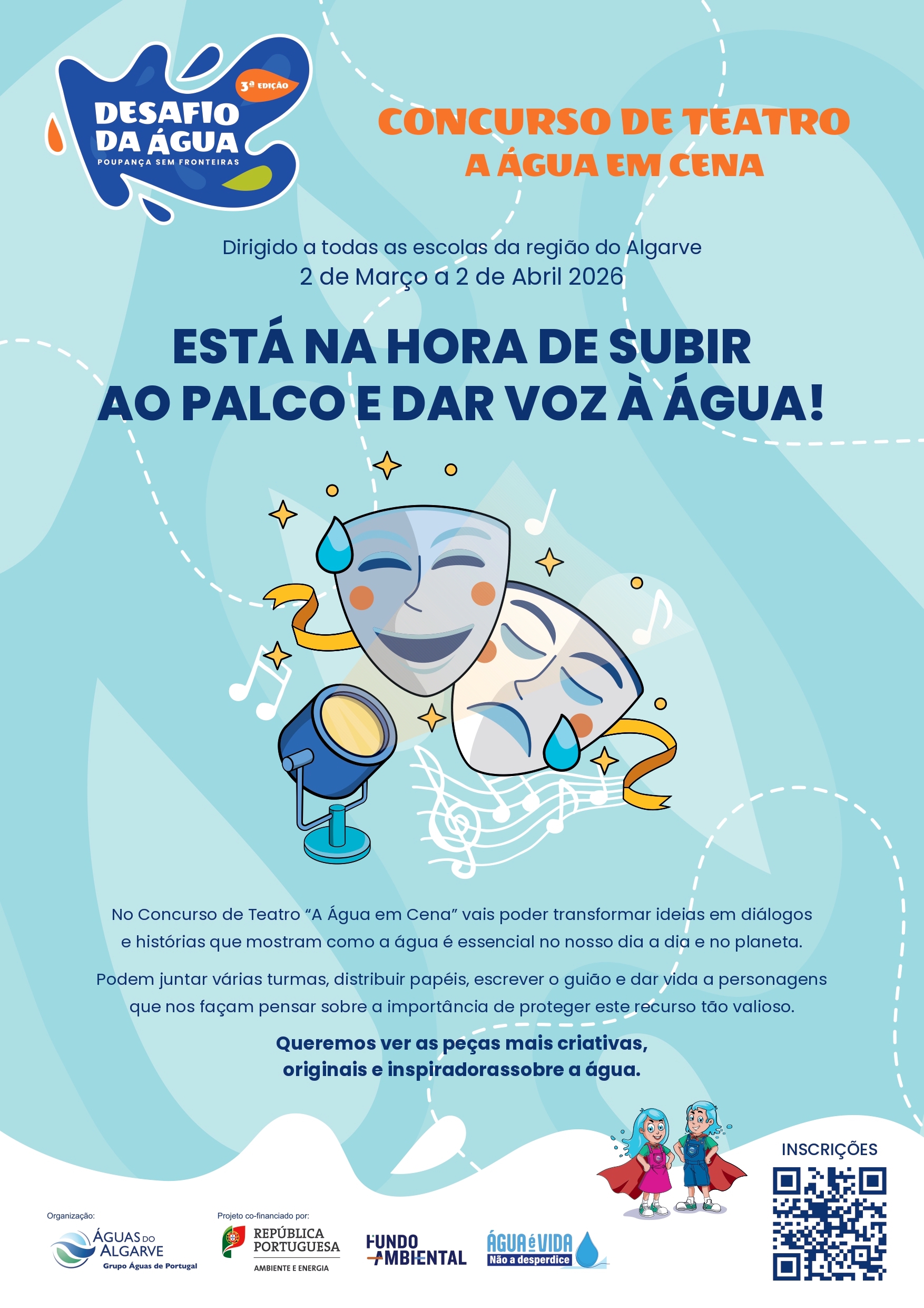 A Águas do Algarve, através do projeto educativo Desafio da Água, está a promover o concurso de teatro escolar “A Água em Cena”, uma iniciativa dirigida às escolas da região que pretende sensibilizar os alunos para a importância deste recurso natural através da criatividade e da expressão artística.