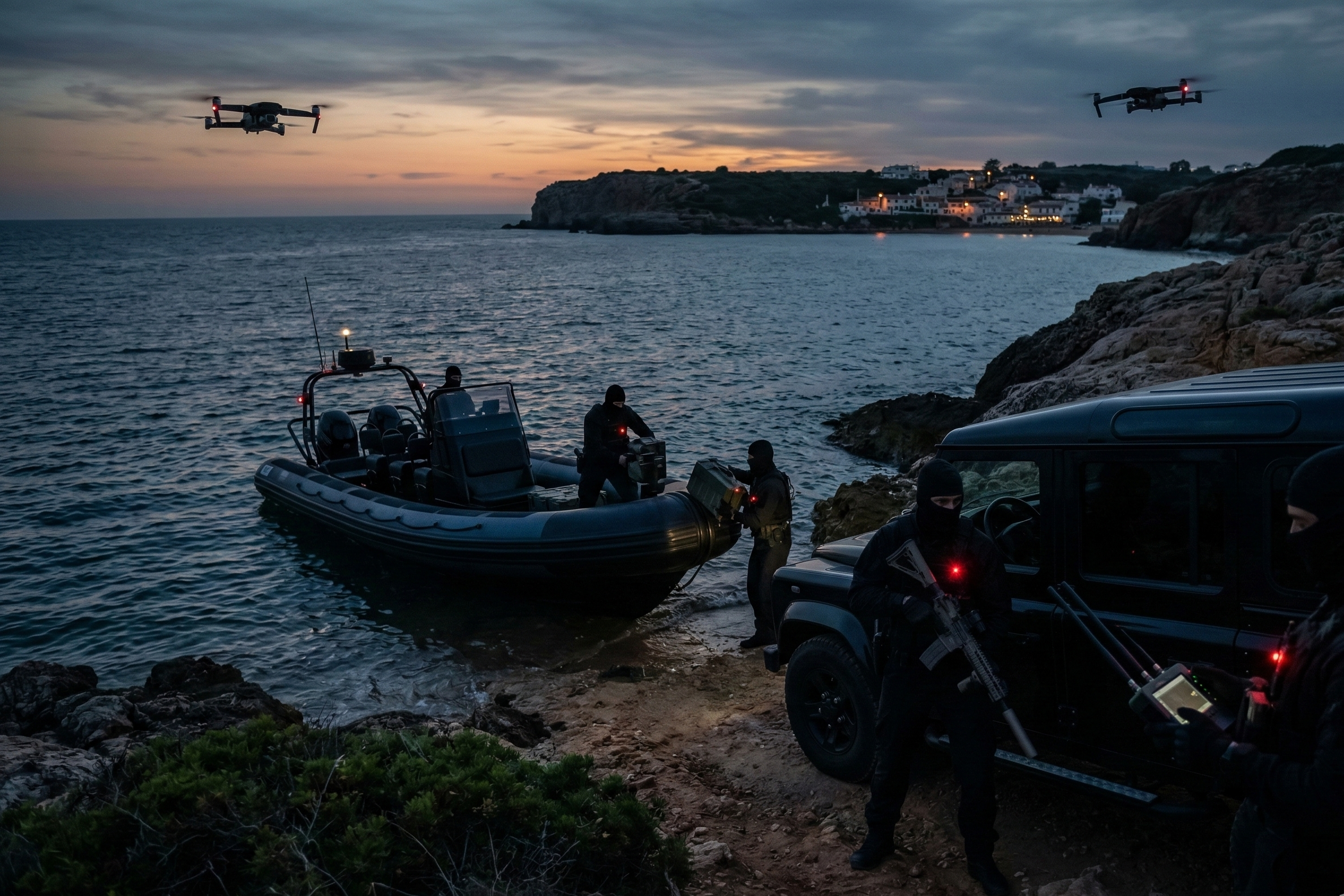 Explica a referida fonte que as redes dispõem agora de operacionais dedicados exclusivamente à segurança do transporte. Imagens recolhidas pelas autoridades espanholas perto da fronteira com Portugal mostraram movimentações com características vincadamente militares no terreno. Os elementos filmados atuavam como uma escolta profissionalizada, levantando a forte suspeita de que se tratam de mercenários com treino tático contratados para blindar os percursos.