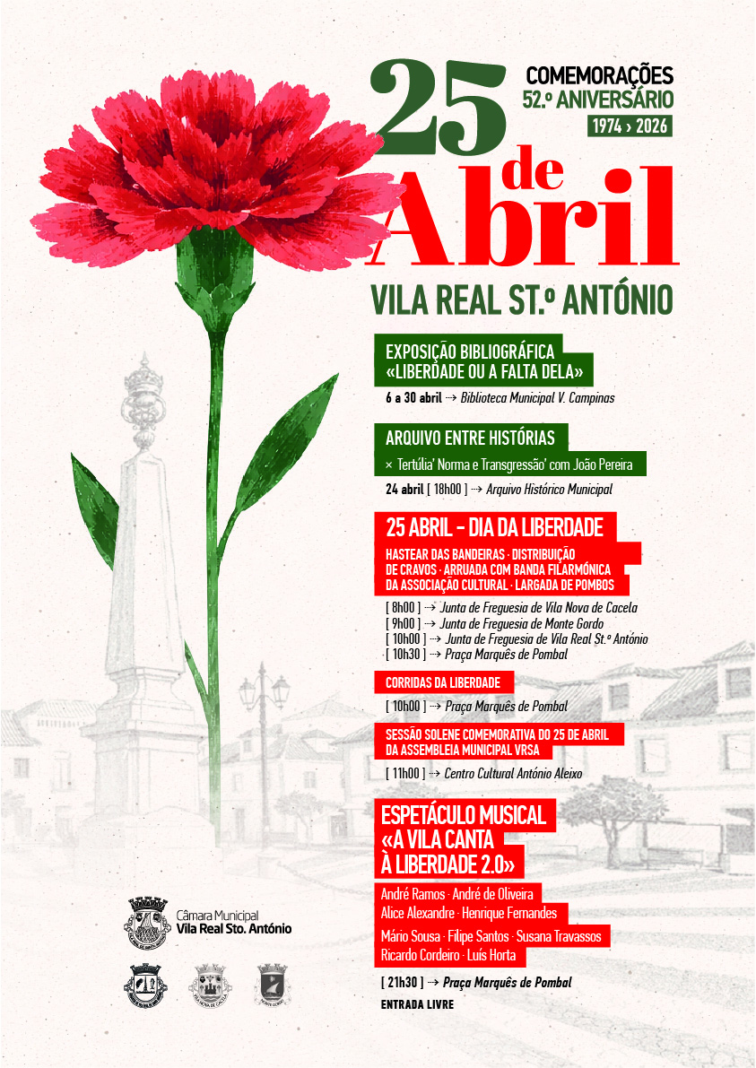 As comemorações do dia 25 de Abril iniciam-se com o hastear das bandeiras e uma arruada com a Banda Filarmónica da Associação Cultural de VRSA, acompanhada pela distribuição de cravos nas freguesias de Vila Nova de Cacela (08:00), Monte Gordo (09:00) e Vila Real de Santo António (10:00).