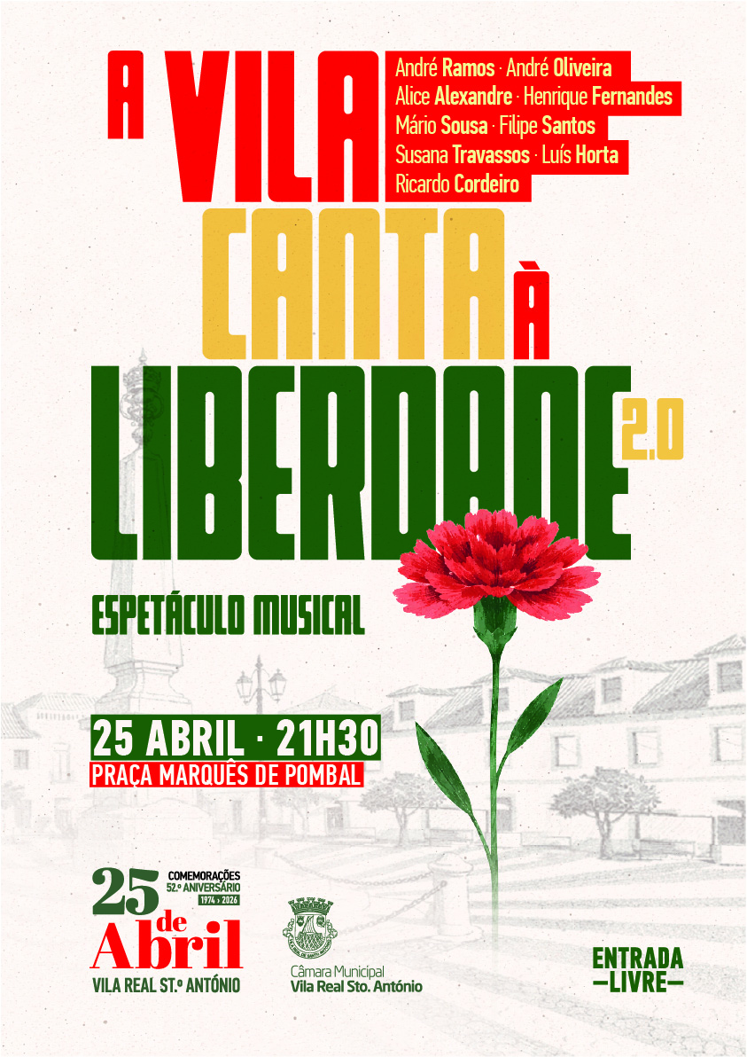 As comemorações culminam com o espetáculo “A Vila Canta à Liberdade 2.0”, marcado para as 21:30, na Praça Marquês de Pombal, numa evocação da memória e do espírito de Abril através de novas interpretações do cancioneiro revolucionário.