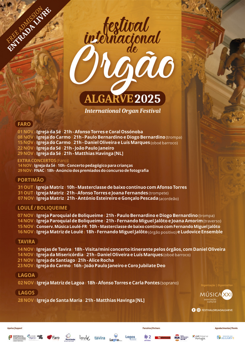 O Festival Internacional de Órgão do Algarve 2025 conta com os apoios da CCDR Algarve – Unidade de Cultura, dos Municípios de Faro, Portimão, Loulé, Tavira, Lagoa e Lagos, e da União de Freguesias de Faro, com o apoio à divulgação da Região de Turismo do Algarve e os parceiros de comunicação Antena 2, Sul Informação e Rua FM.
