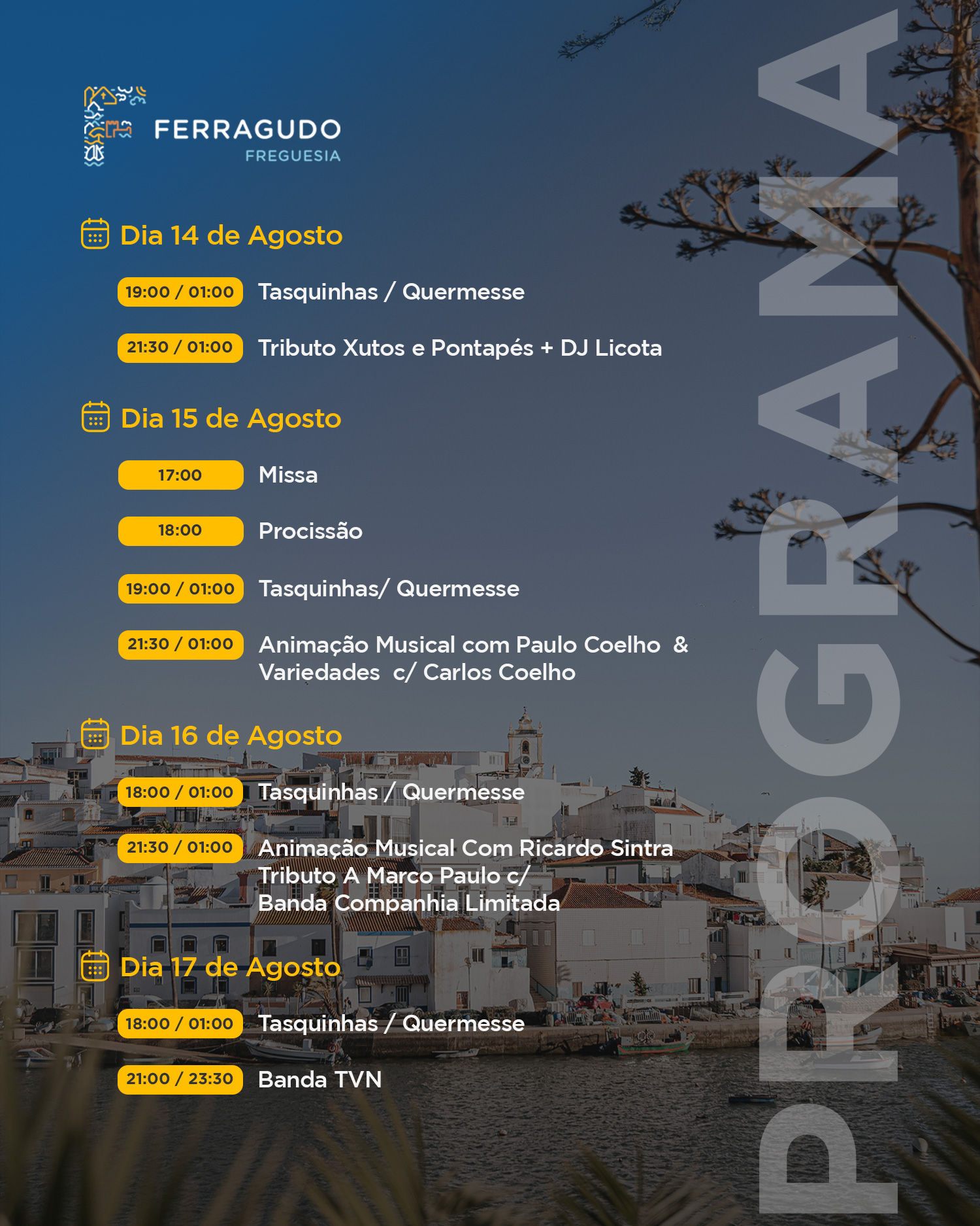 A componente musical da festa arranca este ano mais cedo, com animação noturna a partir das 21:30, entre os dias 14 e 17 de agosto, na baixa de Ferragudo. O ponto alto das festividades terá lugar a 15 de agosto, com a missa solene às 17:00, seguida da procissão pelas ruas da vila.