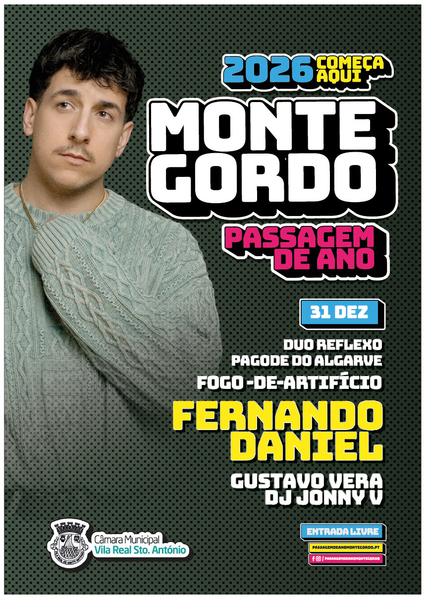 O Município de Vila Real de Santo António divulgou que Fernando Daniel será o artista principal da Passagem de Ano em Monte Gordo, subindo ao palco a partir das 00:15, naquele que será o seu primeiro espetáculo de 2026.