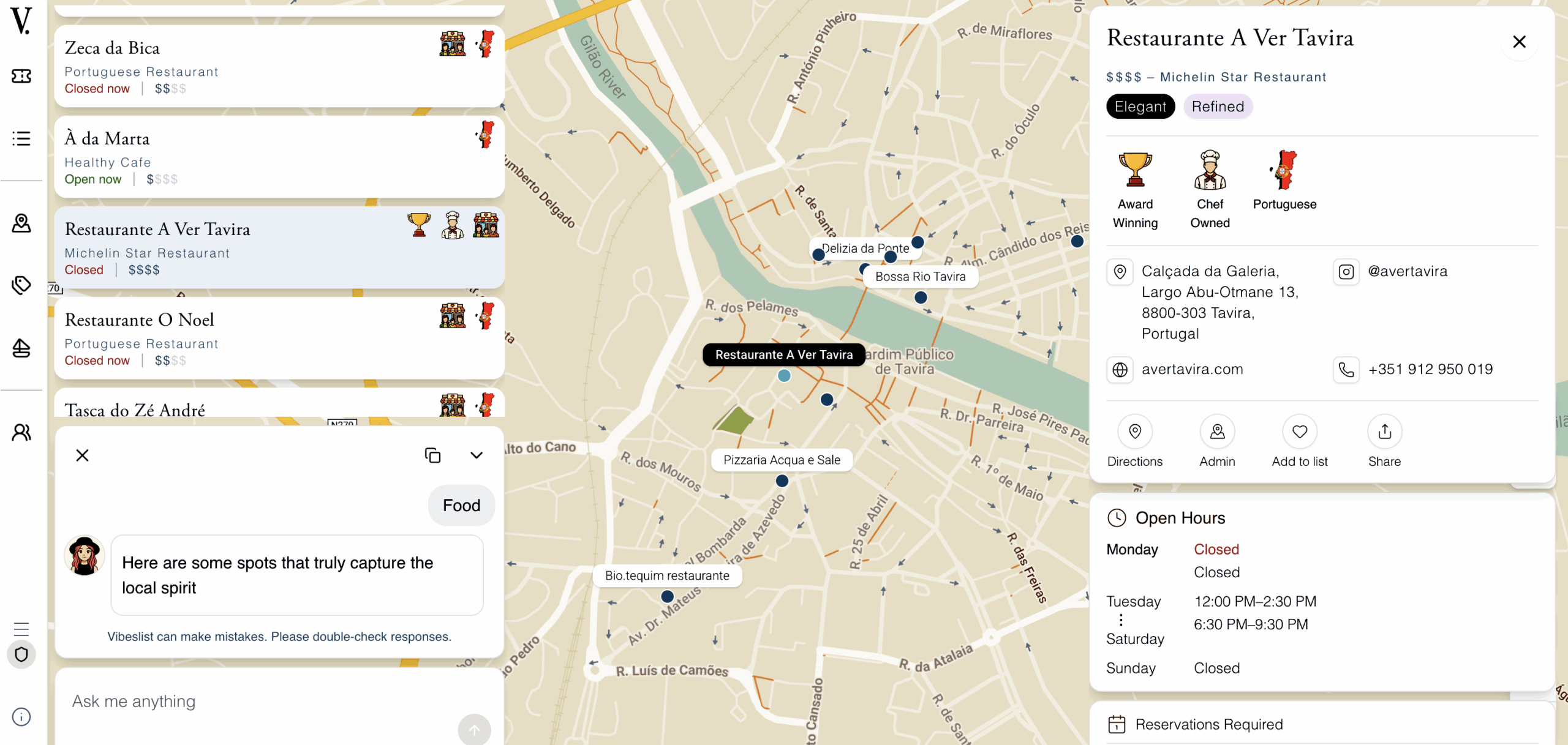Por meio de um chat de pesquisa intuitivo, o Vibeslist apresenta em segundos uma seleção reduzida — entre três a cinco locais — acompanhados dos respetivos Place Cards. A plataforma funciona como uma conversa contínua, capaz de recordar diálogos anteriores e adaptar sugestões à medida que o utilizador interage. “Quanto mais o diálogo se aprofunda, mais esse amigo entende como nos ajudar”, explica a equipa, que está a desenvolver funcionalidades para permitir que a IA aprenda com os gostos de cada utilizador sem necessidade de perfis formais.