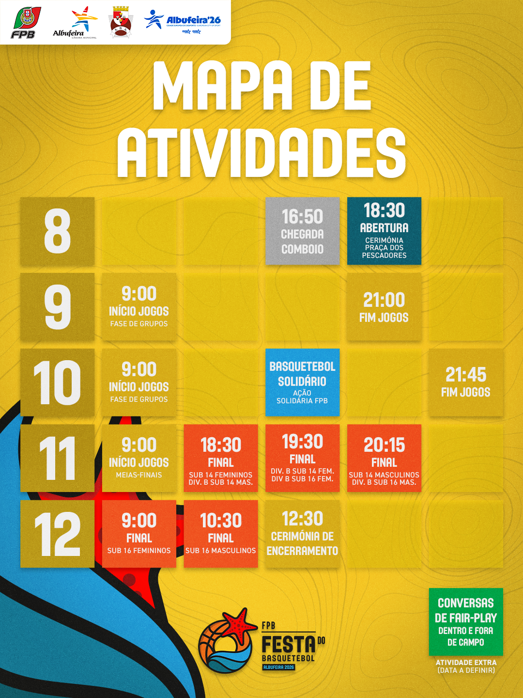 As finais dos escalões Sub16 feminino e masculino disputam-se no dia 12, a partir das 09:00, seguindo-se a cerimónia de encerramento.