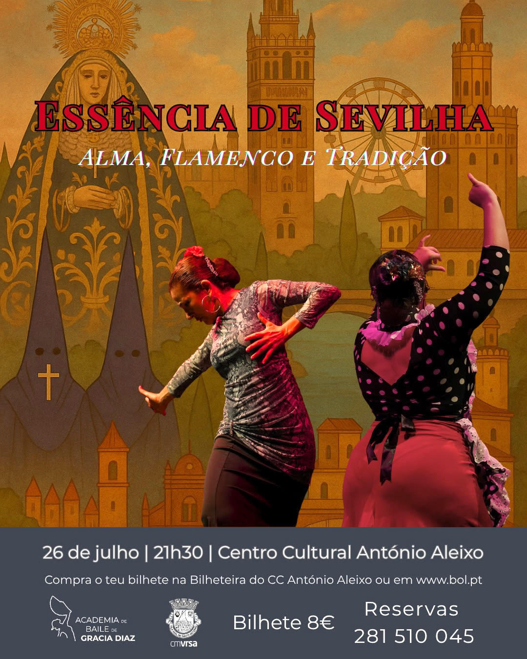 O Centro Cultural António Aleixo, em Vila Real de Santo António, recebe no próximo dia 26 de julho, às 21:30, o espetáculo “Essência de Sevilha: Alma, Flamenco e Tradição”, uma celebração intensa e emotiva da cultura andaluza.