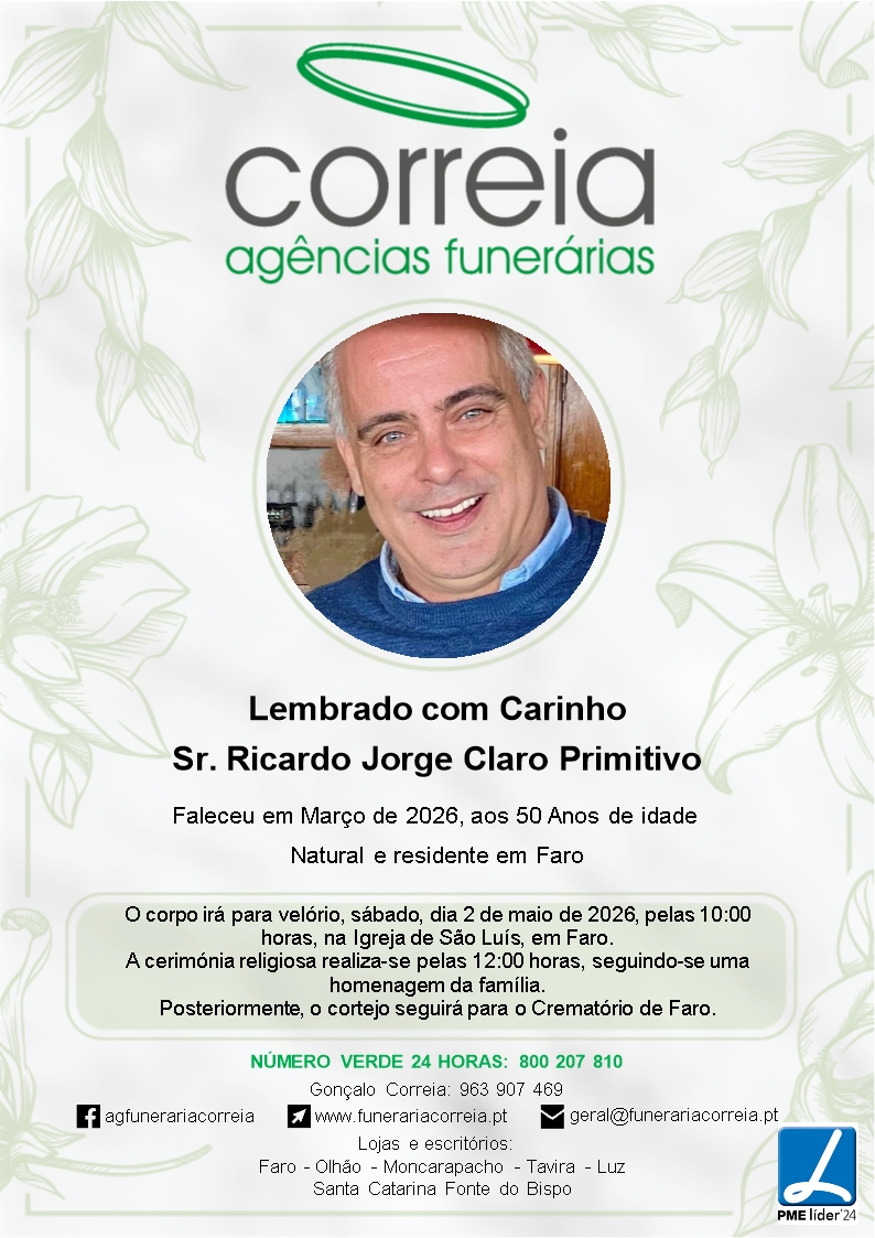 O funeral de Ricardo Claro, gestor do restaurante de luxo Well, em Vale do Lobo, e antigo jornalista do POSTAL, terá lugar no próximo sábado, dia 2 de maio, em Faro.