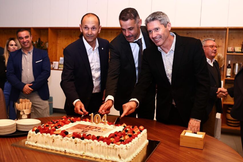A celebração incluiu uma prova de vinhos, culminando com o tradicional momento de cantar os parabéns e o corte do bolo de aniversário.