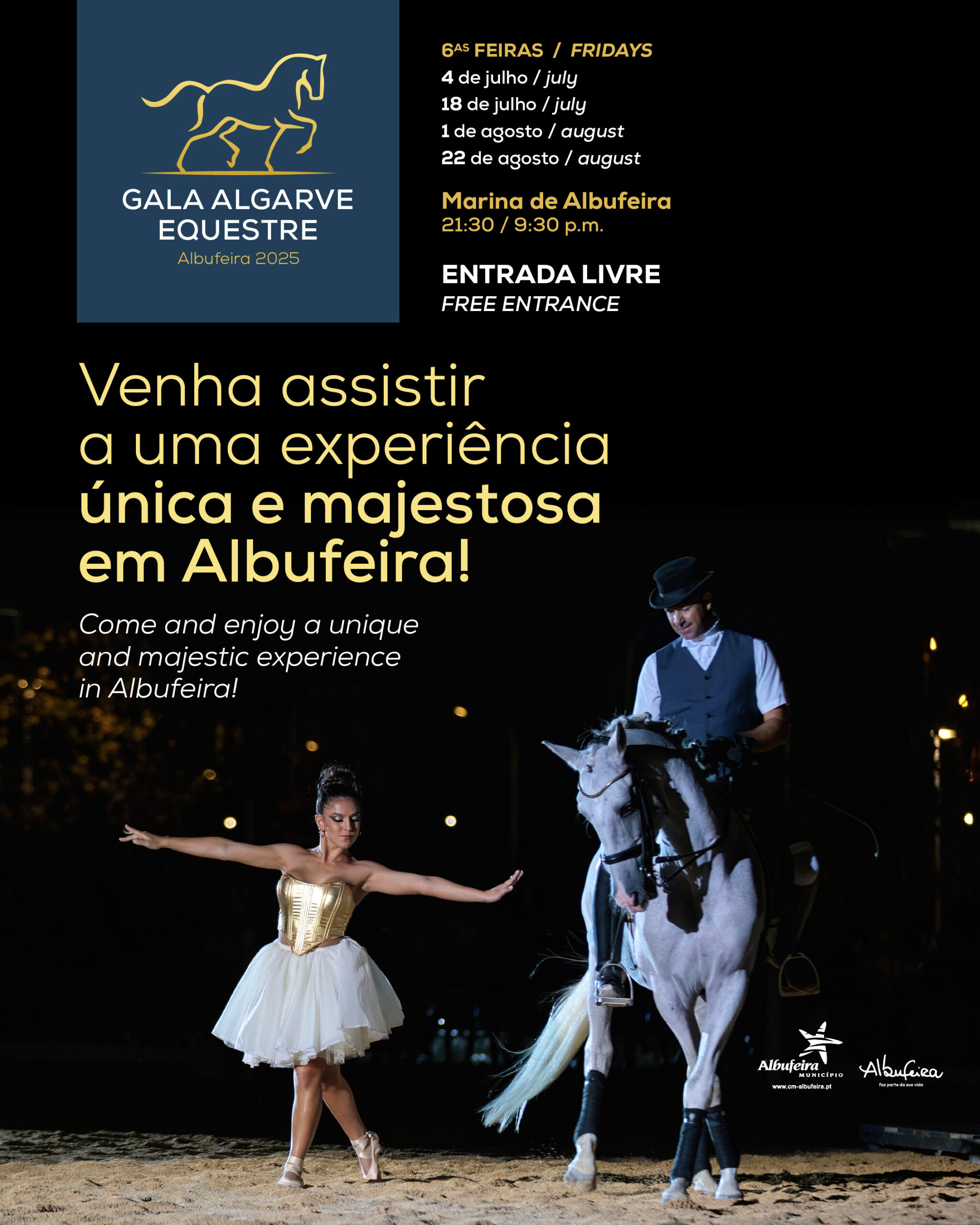 A Gala Algarve Equestre realiza-se na Marina de Albufeira nos dias 4 e 18 de julho, e nos dias 1 e 22 de agosto, sempre com entrada gratuita. O evento volta a afirmar-se como uma das mais elegantes e cativantes propostas culturais do verão algarvio.