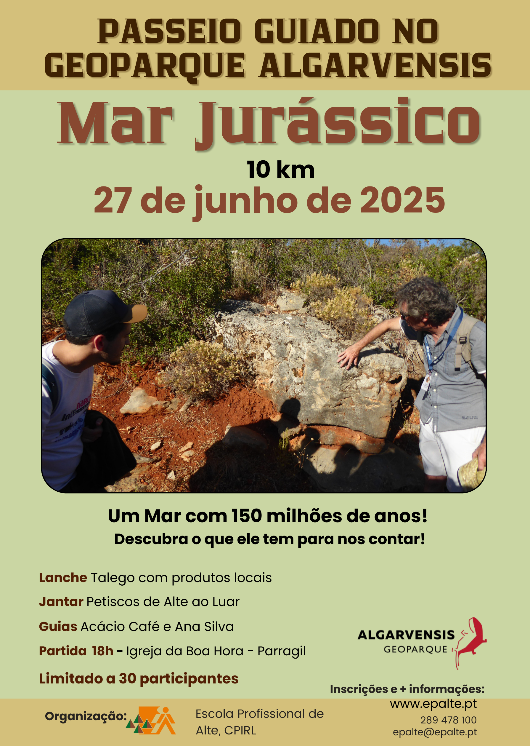 O passeio “Mar Jurássico” é promovido pela Escola Profissional de Alte e está limitada a 30 participantes. O regresso ao ponto de partida será assegurado por autocarro da escola, garantindo conforto e segurança no final do passeio.