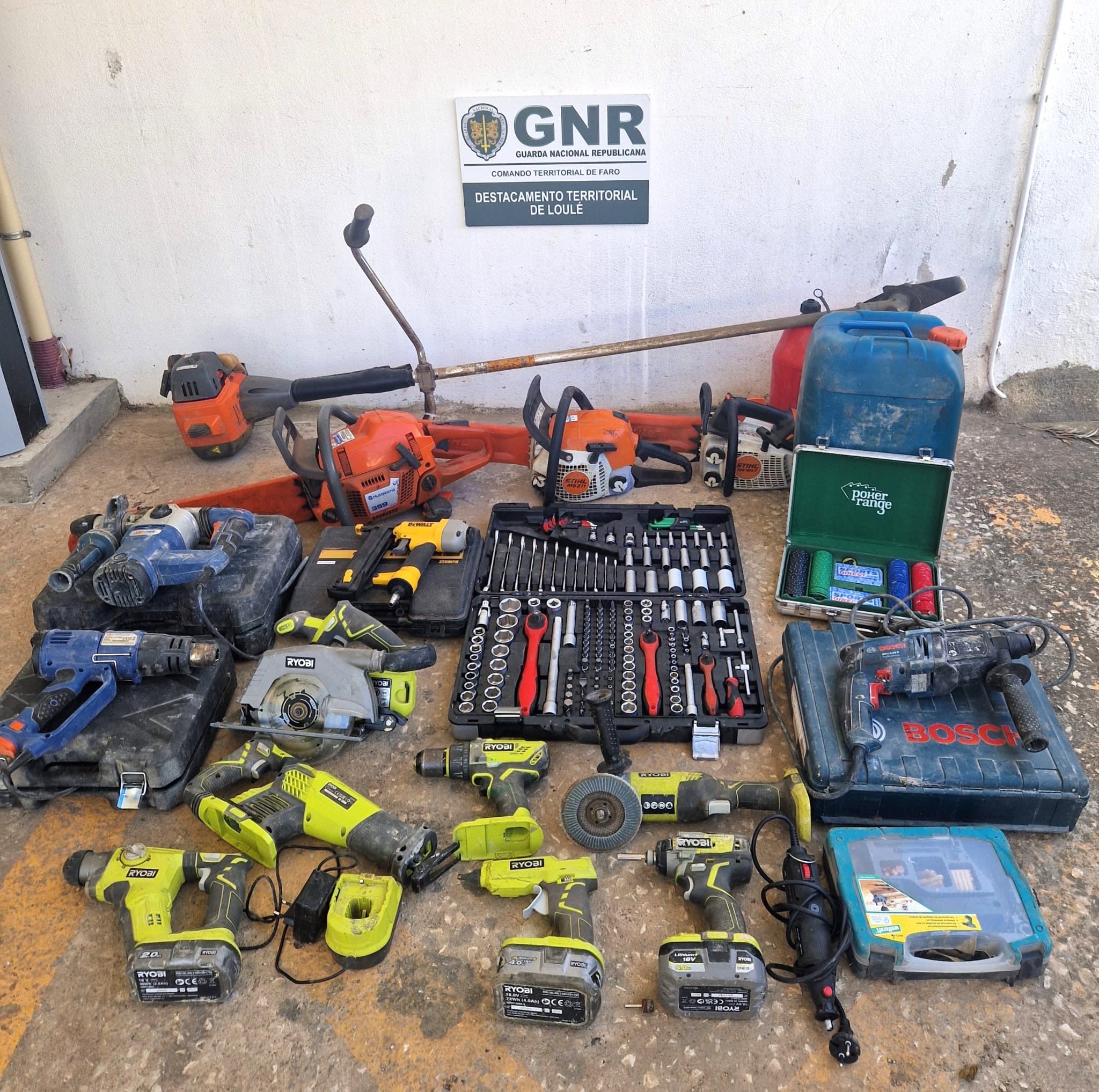 Entre os bens recuperados estão três martelos elétricos, três motosserras, duas serras elétricas, duas aparafusadoras, uma pistola de agrafos com respetiva caixa de agrafos, uma rebarbadora, uma roçadora, uma caixa de roquetes e respetivos acessórios, uma dremel de gravação, uma pistola de ar quente, uma pistola de cola quente, diversas ferramentas de pequeno porte e uma viatura.