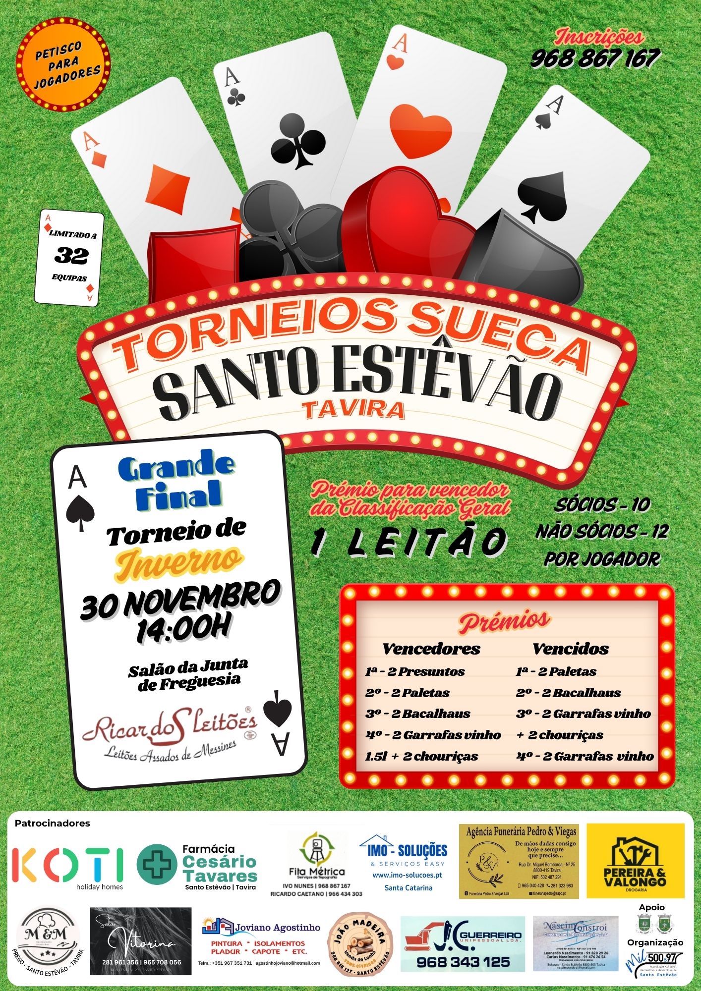 A Associação 1597 – Associação Cultural, Recreativa e Desportiva de Santo Estêvão promove no próximo domingo, 30 de novembro, a Grande Final dos Torneios de Sueca, marcada para as 14:00, no Salão da Junta de Freguesia de Santo Estêvão, em Tavira.