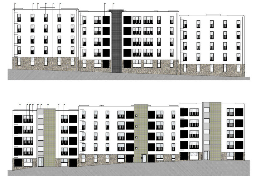 O projeto contempla três blocos habitacionais com cinco pisos cada e tipologias entre T1 e T4.