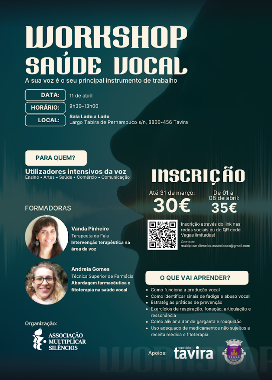 As inscrições para o Workshop de Saúde Vocal decorrem até aos próximos dias, com a iniciativa agendada para 11 de abril, entre as 09:30 e as 13:00, na Sala Lado a Lado, em Tavira.
