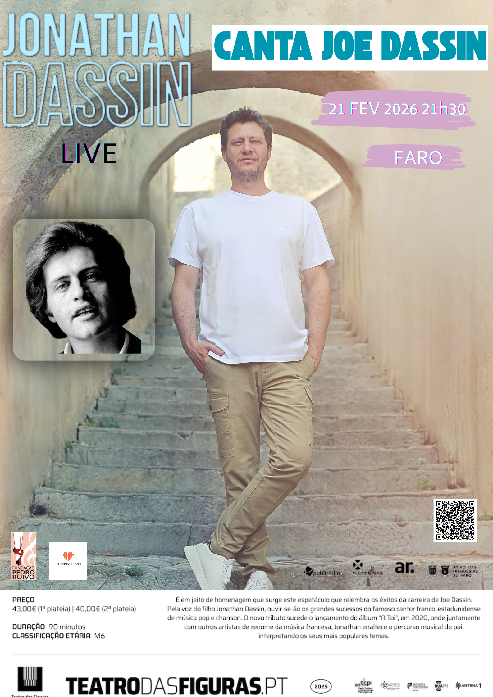 O Teatro das Figuras, em Faro, recebe no dia 21 de fevereiro de 2026, pelas 21:30, o espetáculo “Jonathan Dassin canta Joe Dassin”, uma homenagem musical aos grandes êxitos do cantor franco-estadunidense Joe Dassin.