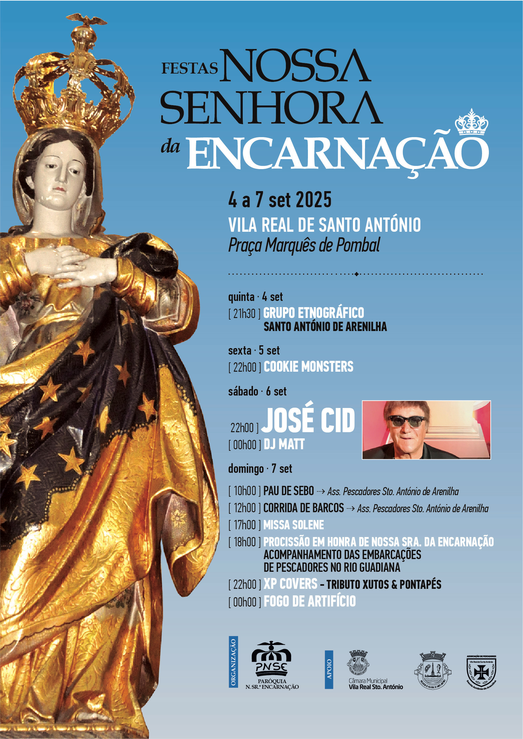 As Festas em Honra de Nossa Senhora da Encarnação regressam a Vila Real de Santo António entre 4 e 7 de setembro, num dos pontos altos da programação de verão. O Município sublinha que o evento “junta moradores e visitantes em torno da padroeira da cidade, através de jogos populares, celebrações religiosas, concertos e um espetáculo de fogo de artifício”.