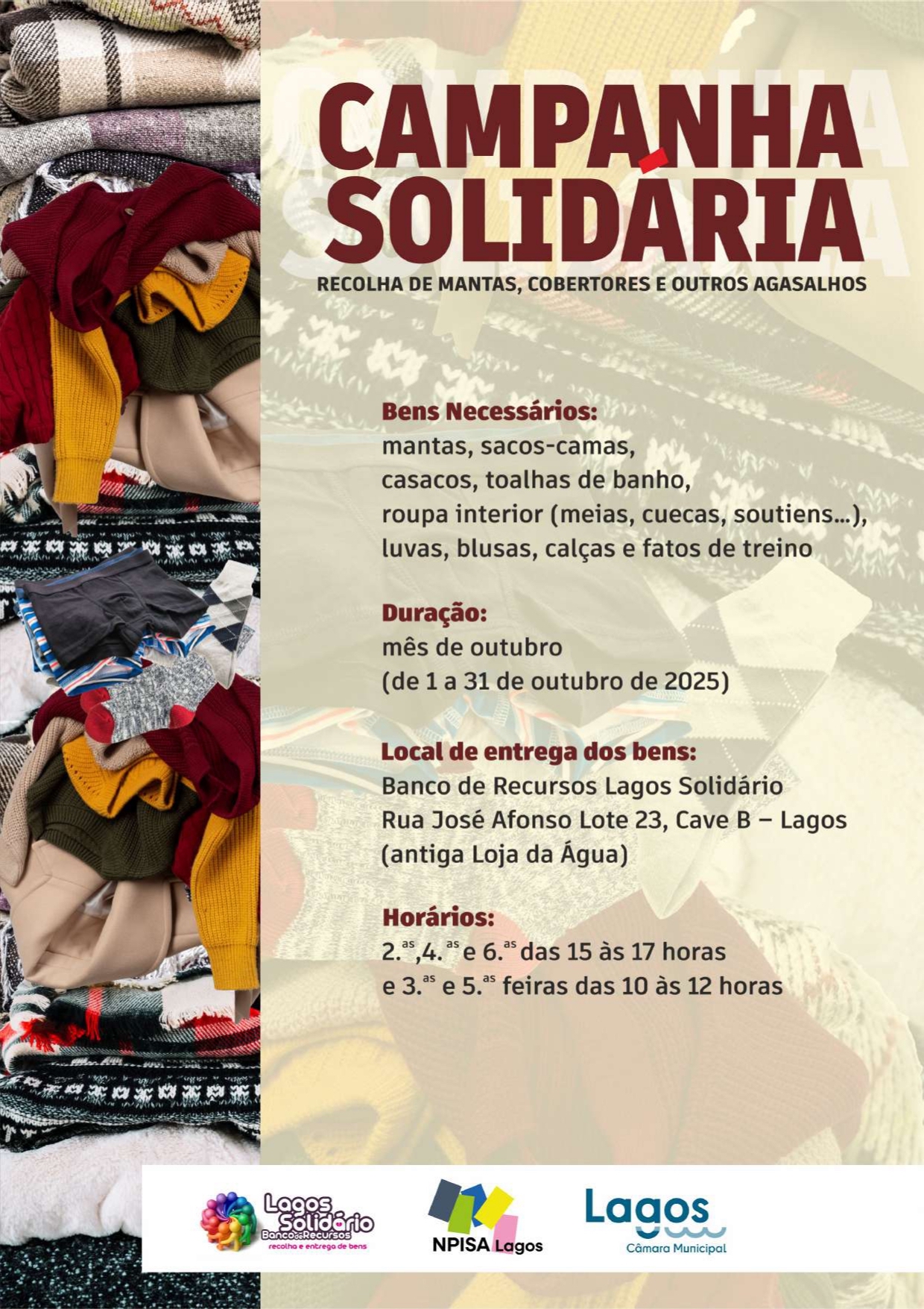 A Câmara Municipal de Lagos, em colaboração com o Banco de Recursos Lagos Solidário e o NPISA (Núcleo de Planeamento e Intervenção Sem-Abrigo), está a promover ao longo do mês de outubro uma campanha solidária de recolha de mantas, cobertores e outros agasalhos.
