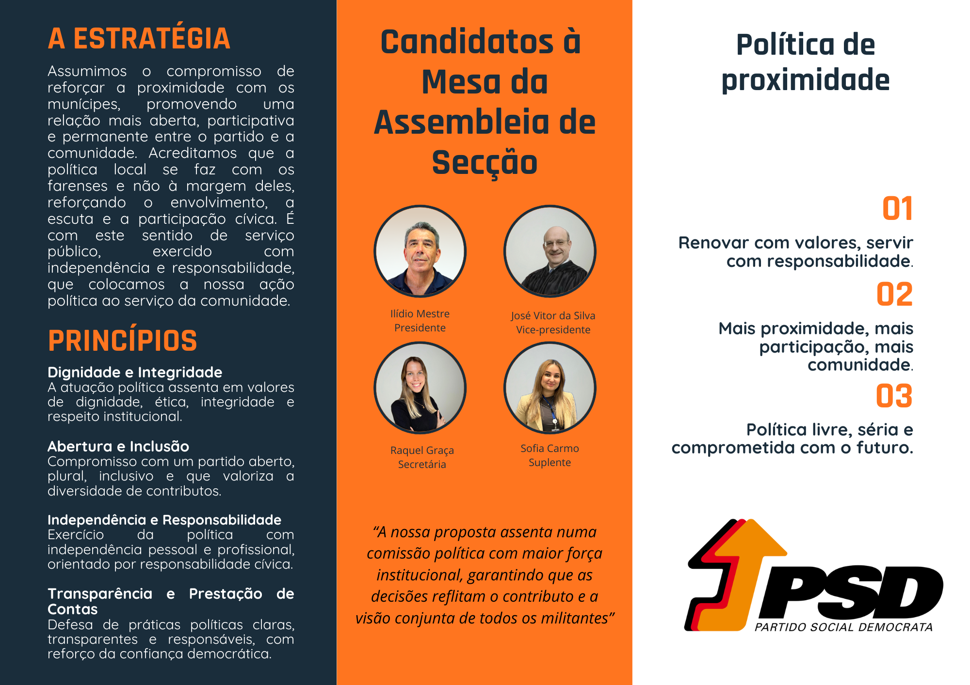 No plano estratégico, a candidatura assume como prioridade reforçar a proximidade com os munícipes, promovendo uma relação mais aberta entre o partido e a comunidade, sustentada na escuta ativa, transparência e prestação de contas.