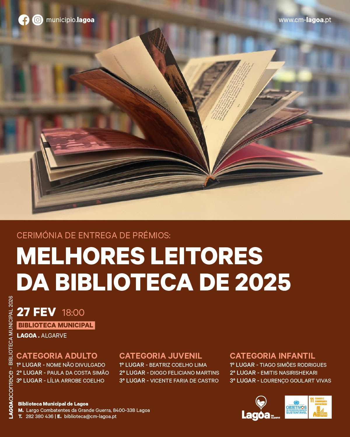 A Biblioteca Municipal de Lagoa promove a iniciativa “Melhores Leitores de 2025” no próximo dia 27 de fevereiro, pelas 18:00, com o objetivo de reconhecer publicamente os leitores que mais se destacaram ao longo do ano nas categorias Adulto, Juvenil e Infantil.