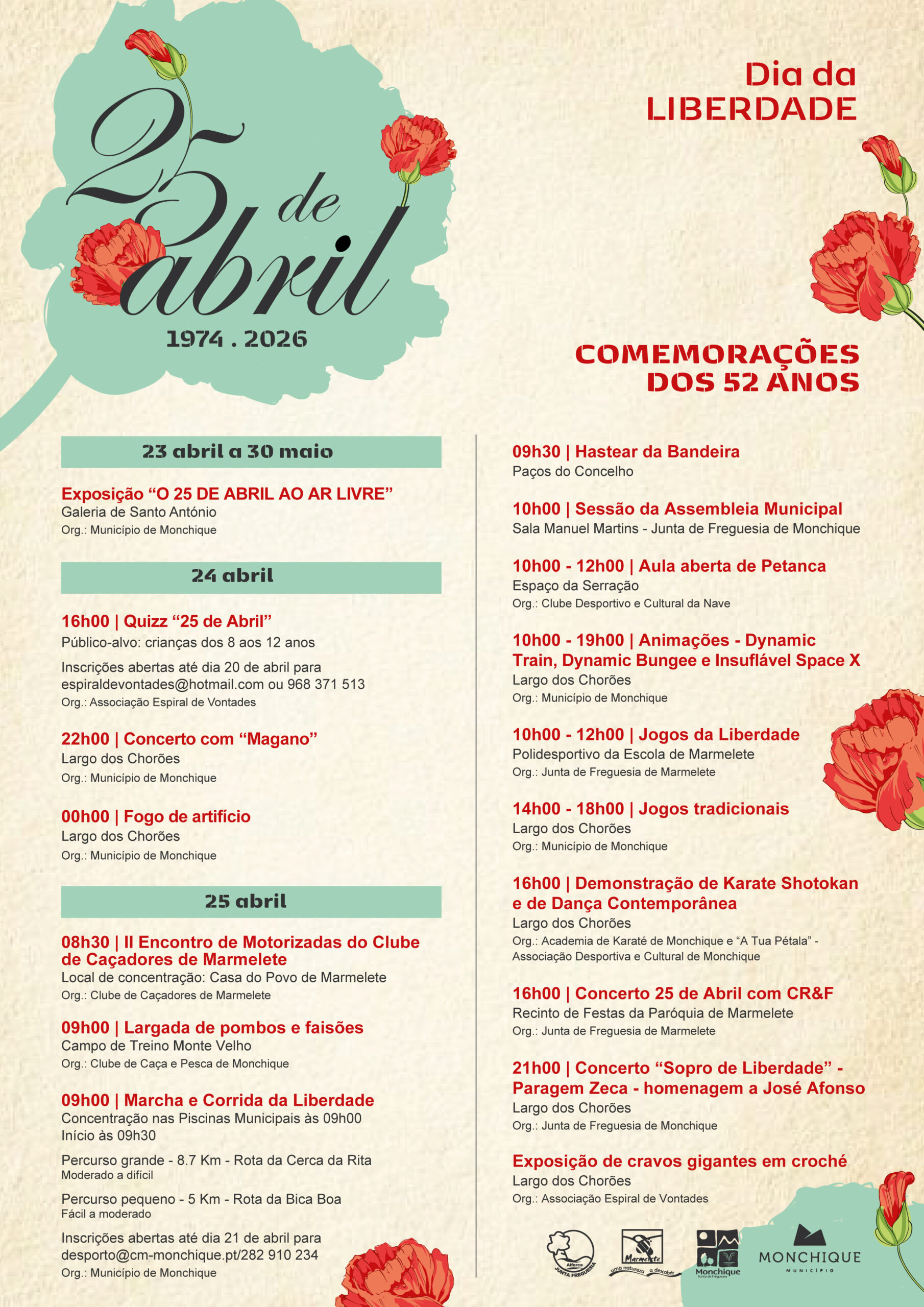 O Município de Monchique vai assinalar o 25 de Abril com um conjunto de iniciativas de caráter cultural e desportivo, que se estendem por vários dias e envolvem diferentes espaços do concelho.