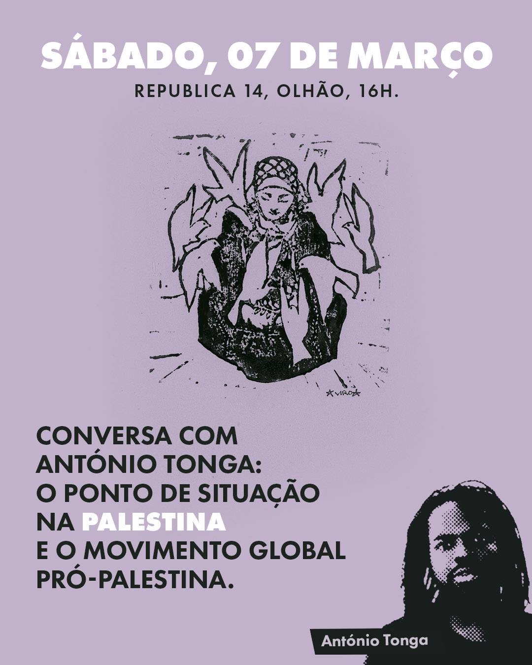 A Associação Cultural República 14, em Olhão, recebe no próximo dia 7 de março, às 16:30, uma conversa pública dedicada à situação atual na Palestina e ao movimento internacional de solidariedade com o povo palestiniano. A iniciativa é promovida pela plataforma cívica apartidária Algarve pela Palestina e terá como convidado o ativista António Tonga.