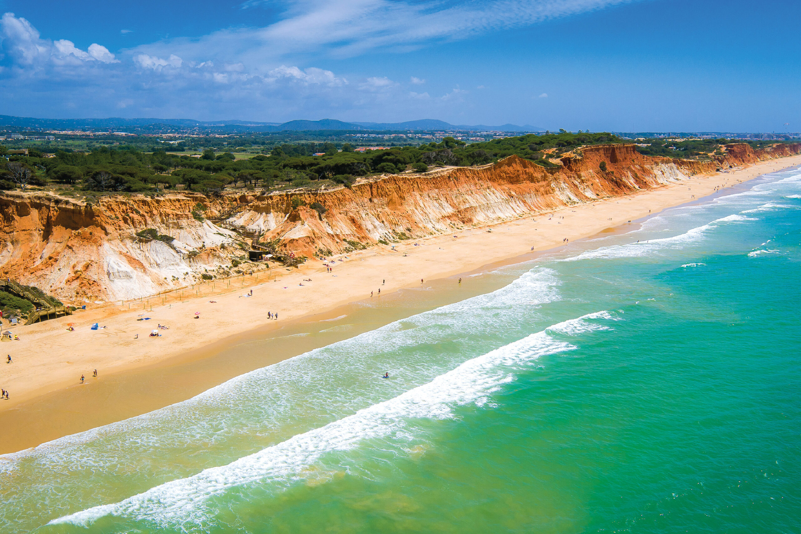 Com cerca de seis quilómetros de extensão, a Praia da Falésia destaca-se igualmente pelo seu valor geológico. Trata-se de uma arriba arenosa com registos que documentam a evolução paleoambiental de milhões de anos. O contraste entre as tonalidades avermelhadas das camadas superiores e as areias claras na base das falésias confere à paisagem uma identidade visual singular.