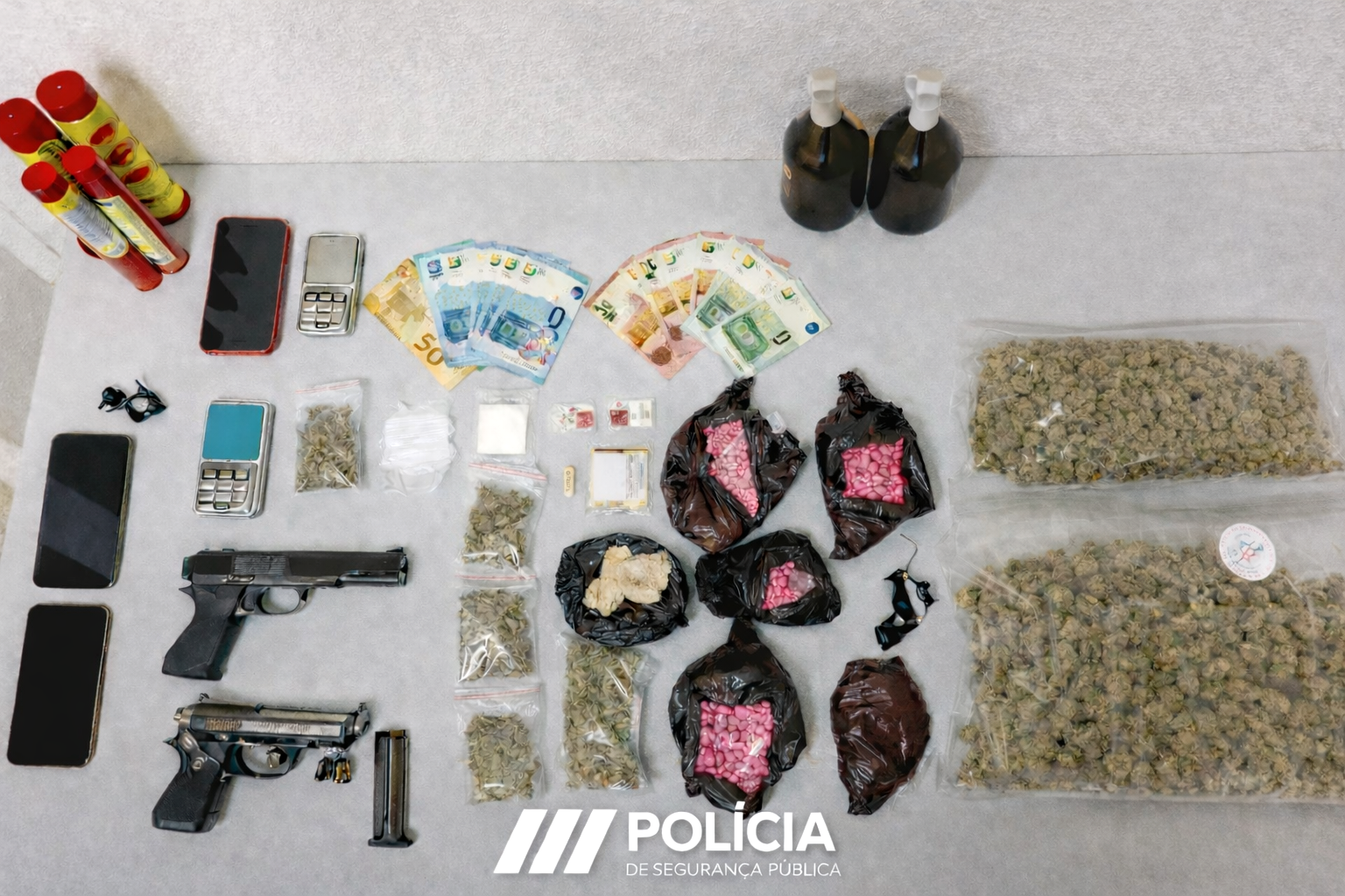 Numa primeira intervenção, foi detido um homem de 38 anos, no decurso de uma investigação por violência doméstica. No cumprimento de mandados de busca, os agentes apreenderam uma pistola de calibre 7,65 mm, nove munições do mesmo calibre, uma arma de ar comprimido, uma balança de precisão, 19 doses individuais de cocaína, 22 doses individuais de haxixe e um telemóvel.