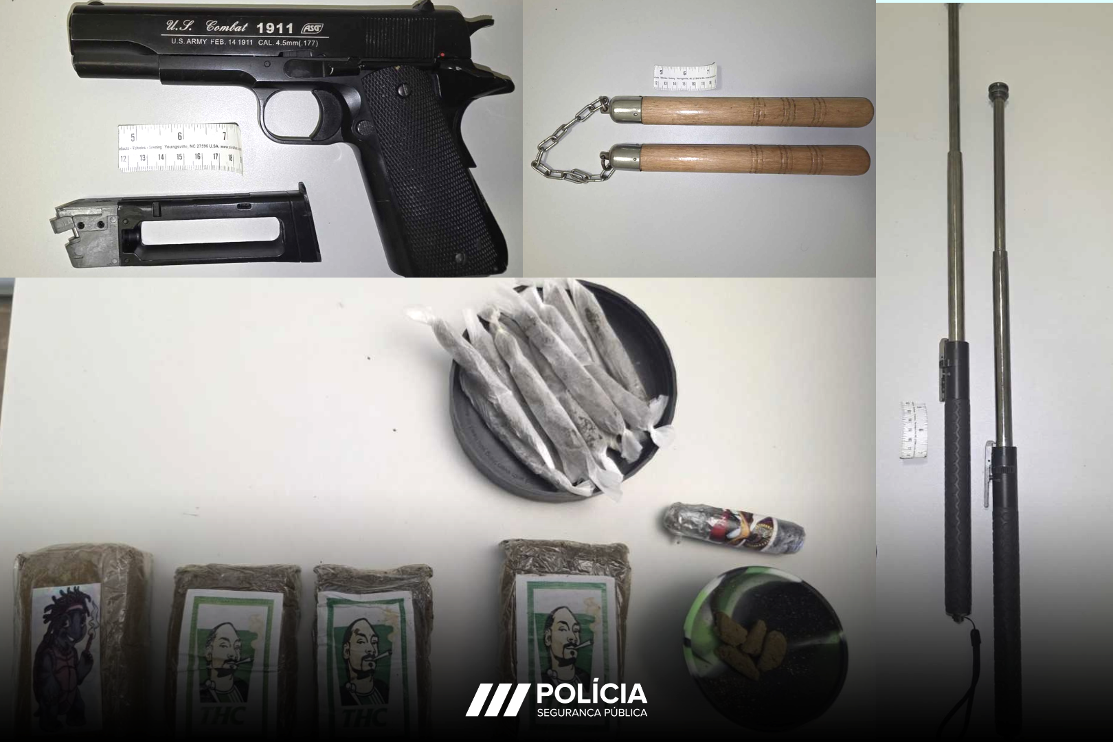 De acordo com o Comando Distrital, foram apreendidos “dois bastões extensíveis, armas brancas, uma arma de airsoft e ainda 882 doses individuais de haxixe”, material que motivou a detenção.