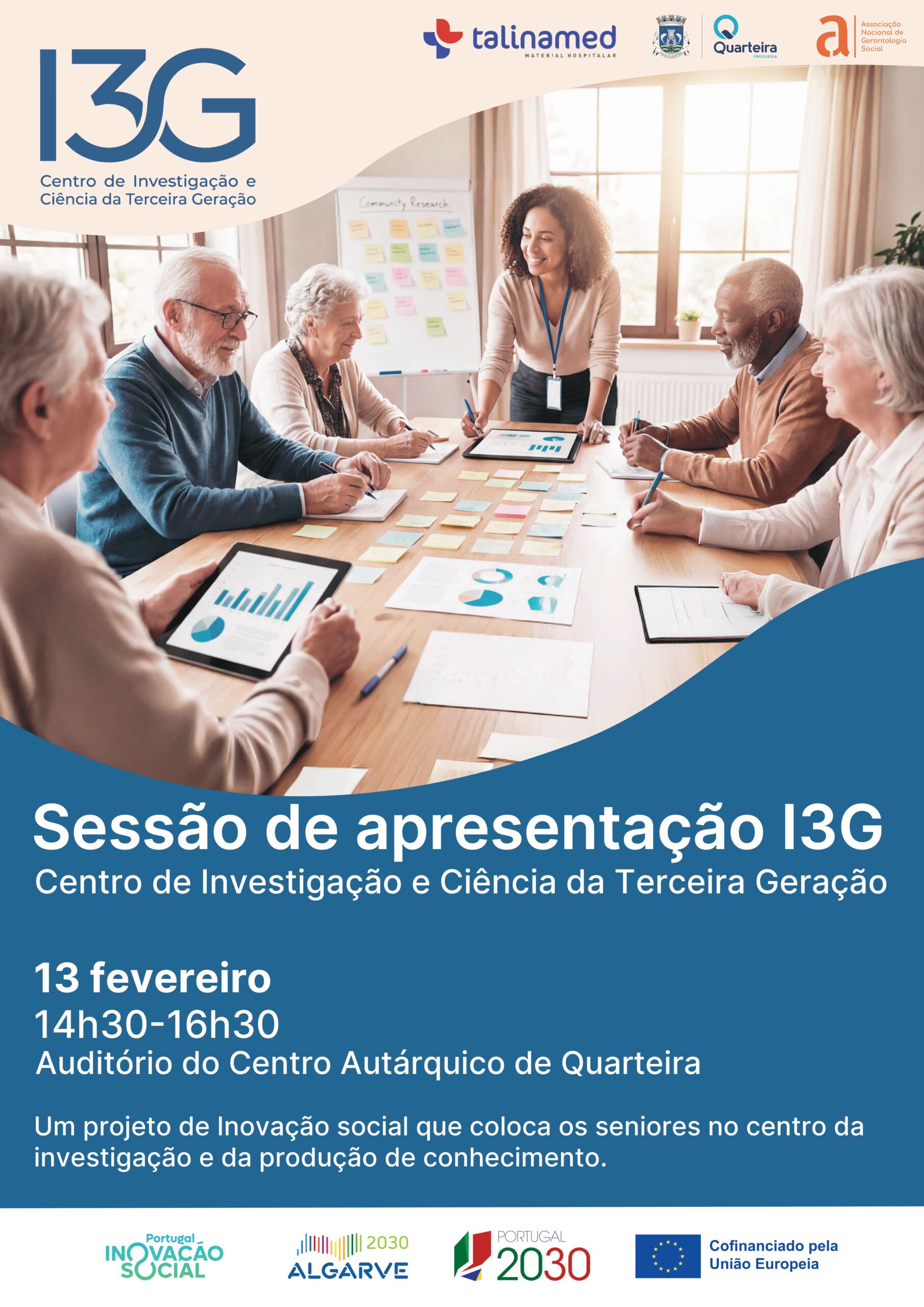 A Sessão de Apresentação do I3G realiza-se no dia 13 de fevereiro, às 14:30, no Auditório do Centro Autárquico da Junta de Freguesia de Quarteira, e destina-se a dar a conhecer o projeto à população e aos parceiros locais.