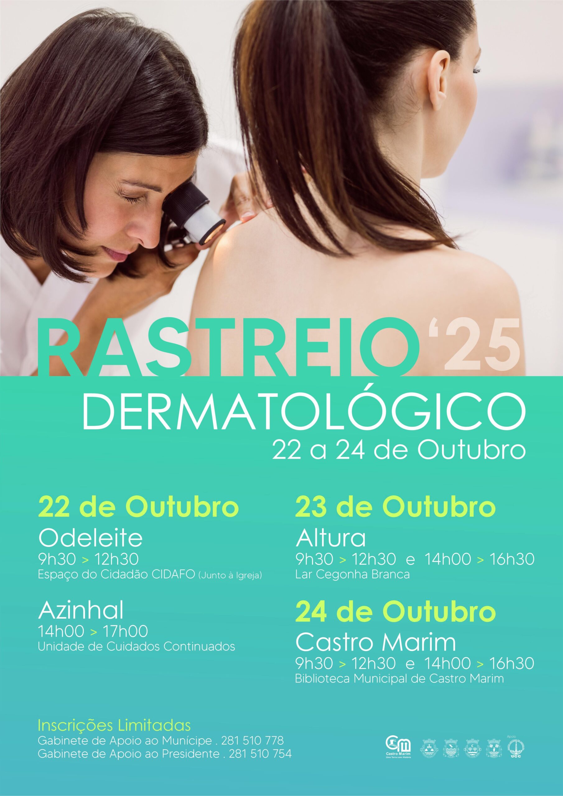 O Município de Castro Marim anunciou a realização de uma nova edição do rastreio gratuito de doenças oncológicas e outras doenças de pele, que terá lugar nos dias 22, 23 e 24 de outubro, abrangendo as localidades de Odeleite, Azinhal, Altura e Castro Marim.