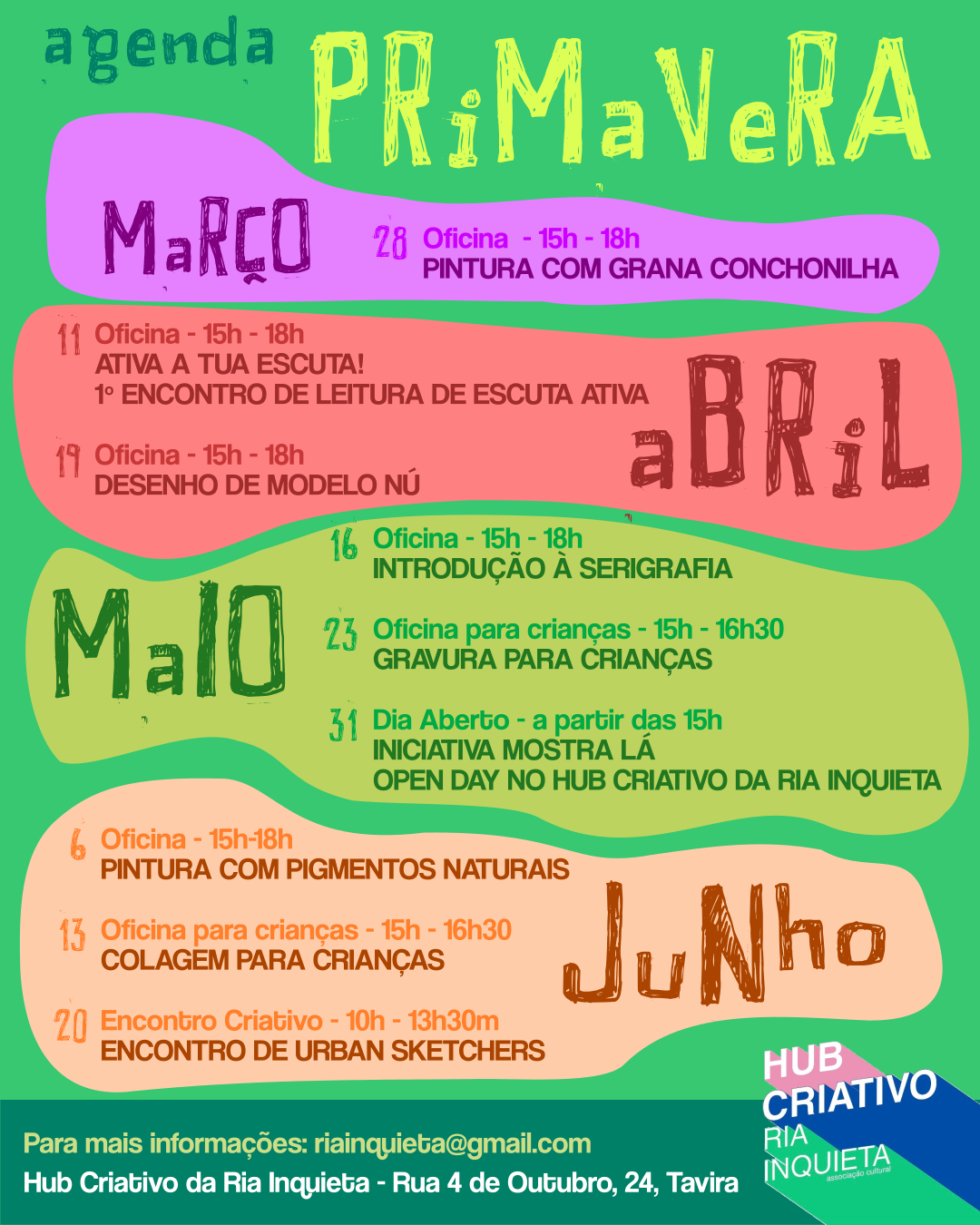 O Hub Criativo da Ria Inquieta, em Tavira, apresenta uma nova programação de primavera, com um conjunto de oficinas e encontros que decorrem entre março e junho.