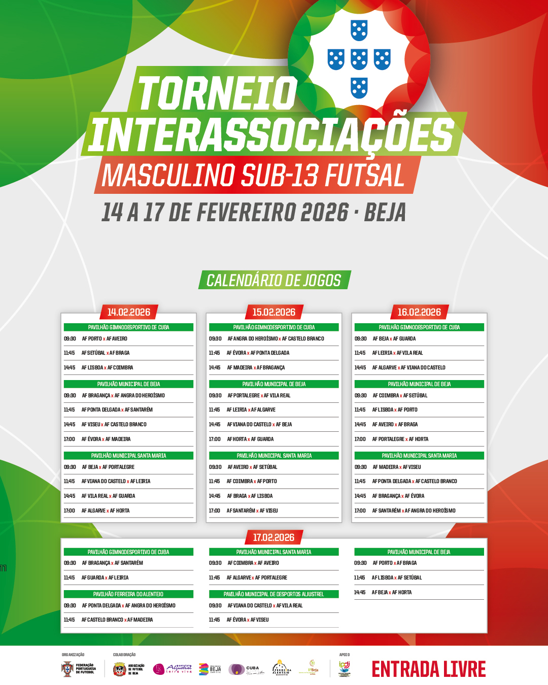 A Associação de Futebol do Algarve informou que a Seleção do Algarve de Futsal Masculino Sub-13 vai participar no Torneio Interassociações da categoria, que decorre entre os dias 14 e 17 de fevereiro, numa organização da Associação de Futebol de Beja.