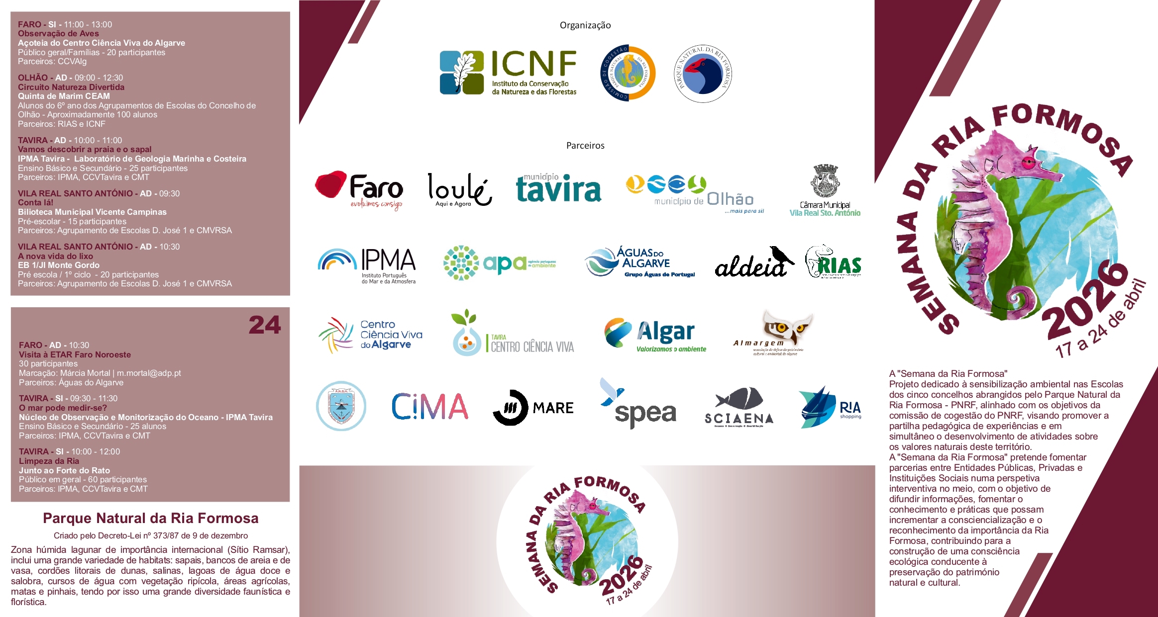 O Município de Tavira associa-se, entre os dias 17 e 24 de abril, à Semana da Ria Formosa, iniciativa que envolve também os concelhos de Faro, Loulé, Olhão e Vila Real de Santo António, abrangidos pelo Parque Natural da Ria Formosa.