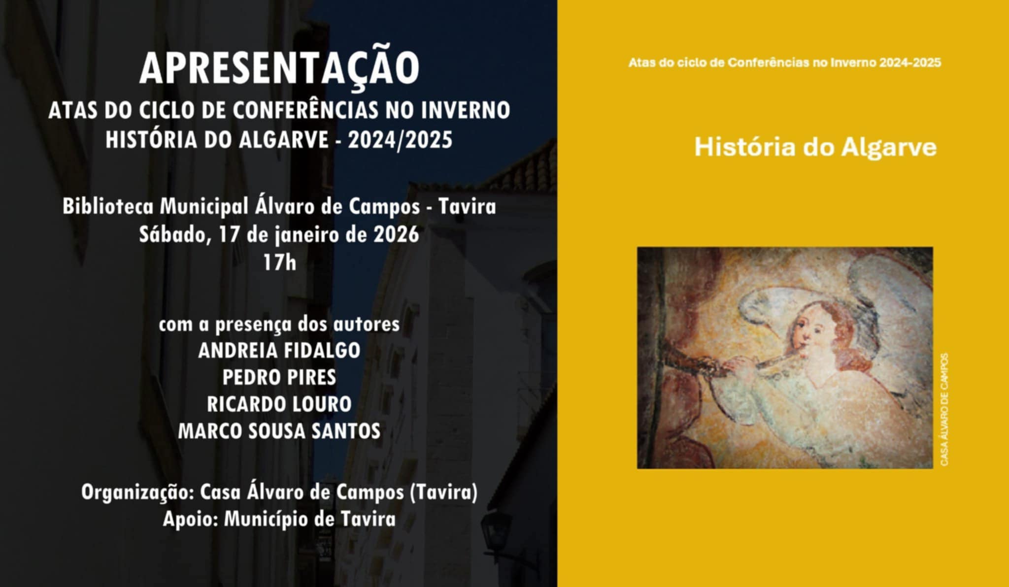 No sábado, 17 de janeiro, pelas 17:00, a Biblioteca Municipal Álvaro de Campos acolhe a apresentação das Atas do Ciclo de Conferências no Inverno – História do Algarve 2024/2025. A sessão conta com a presença dos autores Andreia Fidalgo, Pedro Pires, Ricardo Louro e Marco Sousa Santos, numa iniciativa organizada pela Casa Álvaro de Campos, com o apoio do Município de Tavira.